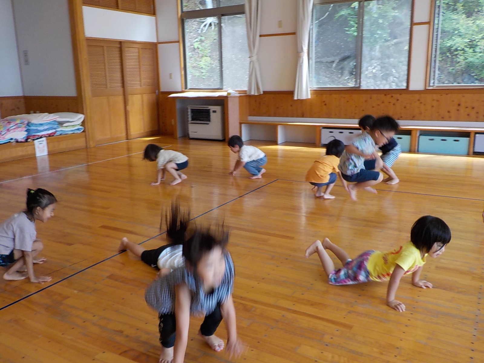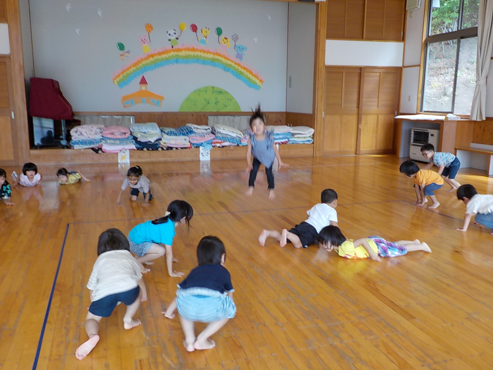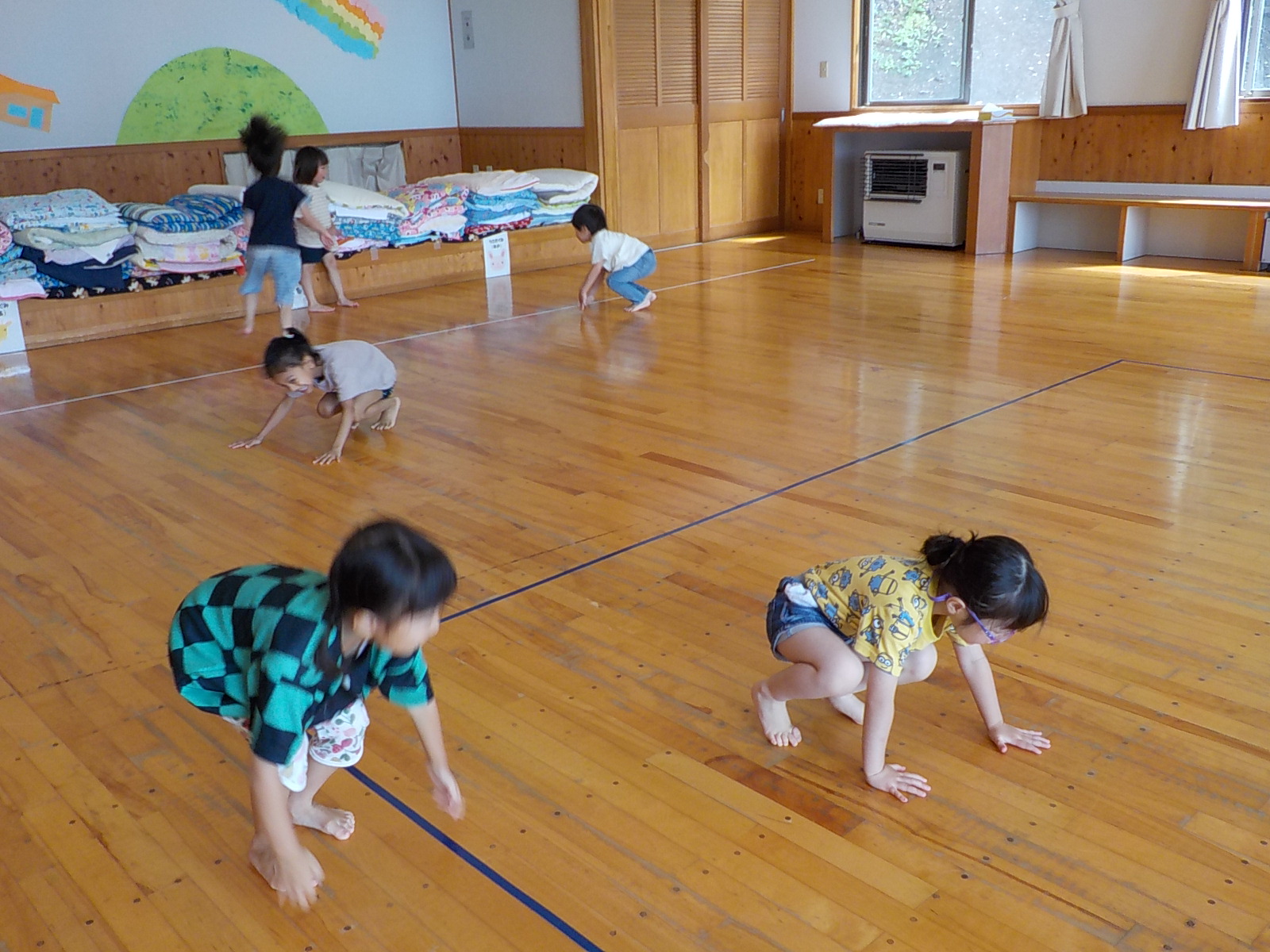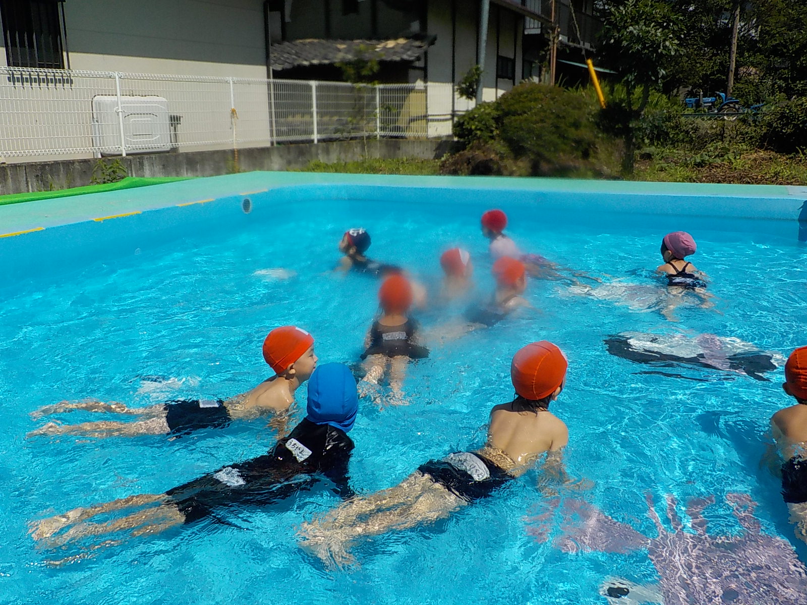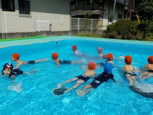 子ども達から「おたまじゃくしは、水の中にいるからプールでもやってみよう!!」と話しが出て
