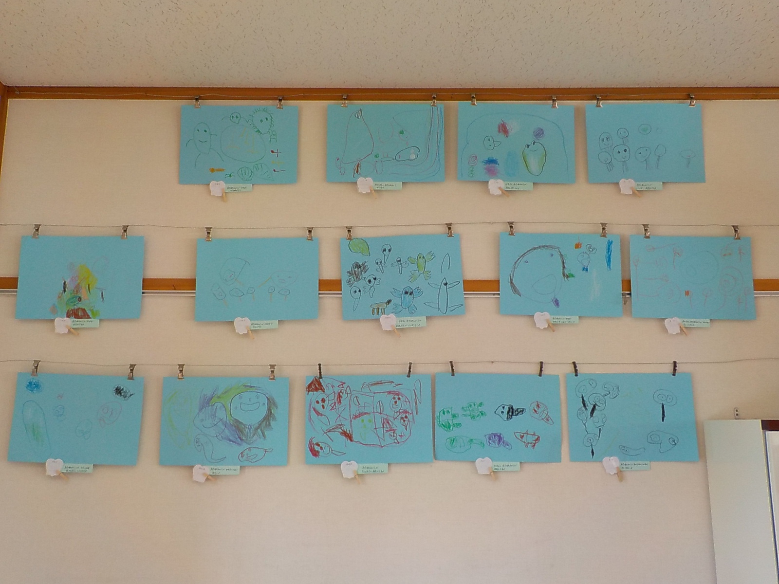 「おたまじゃくしを描きたい!!」と言いみんなで思い思いのおたまじゃくしを描きました。