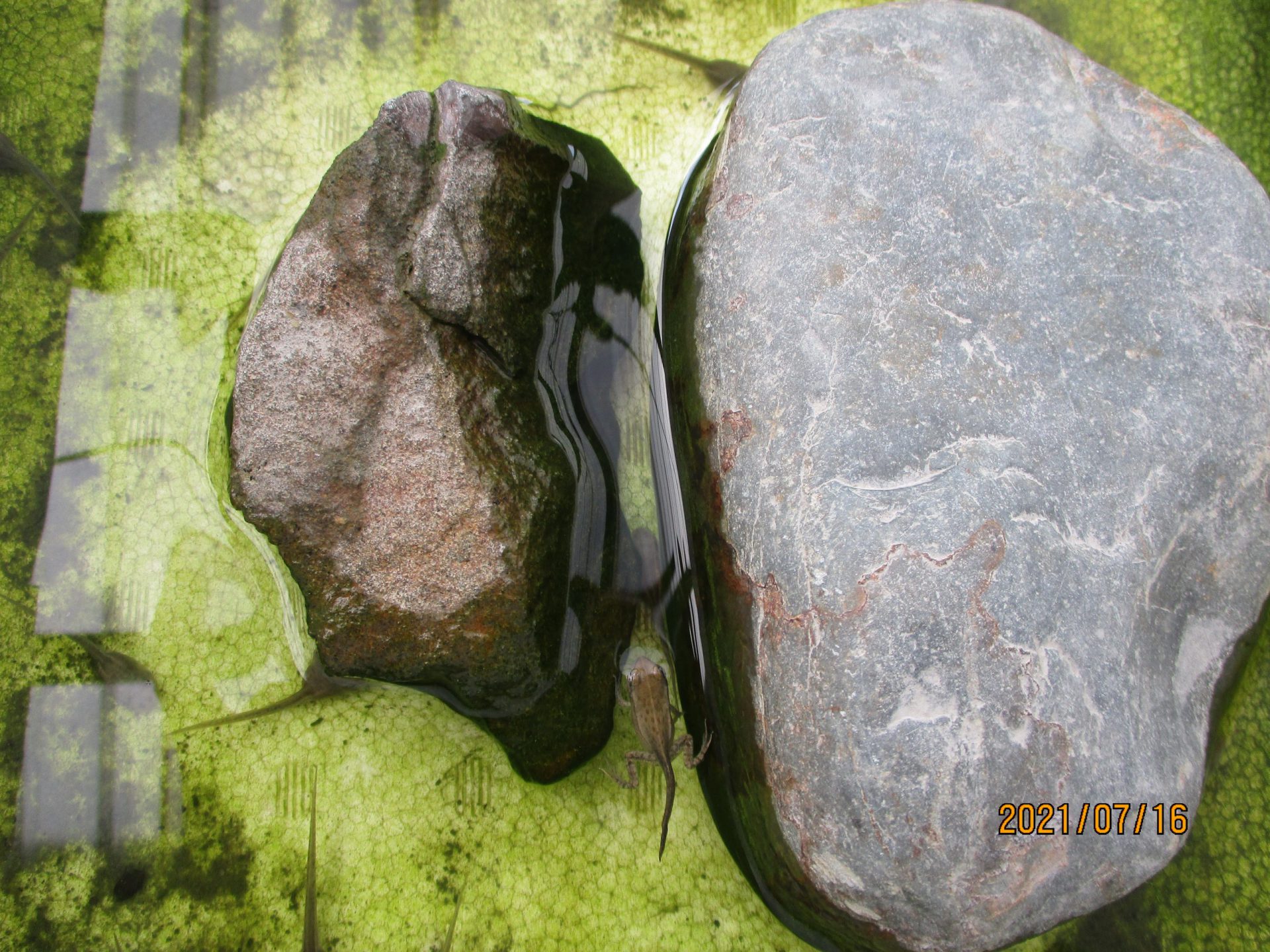 その後、カエルになると水槽から飛び出し園庭へ逃げたが、