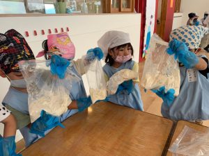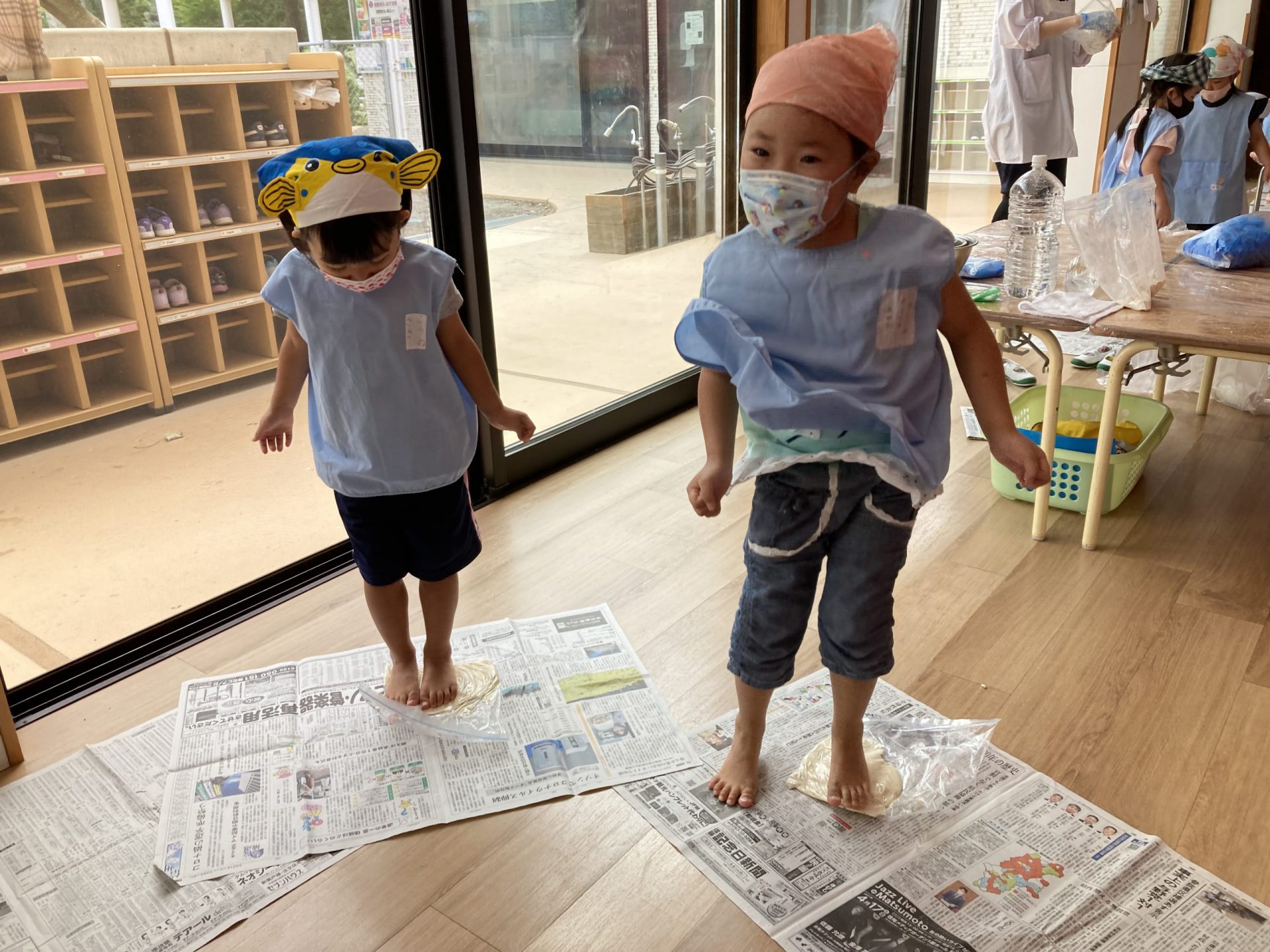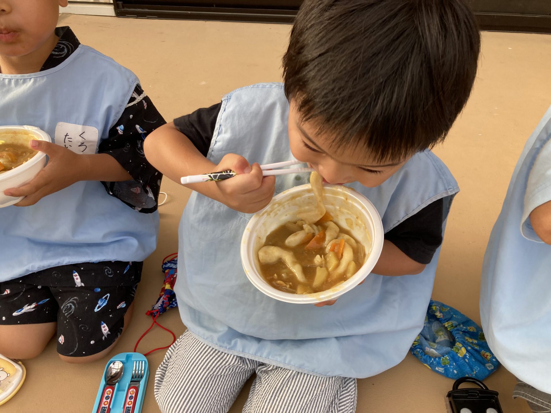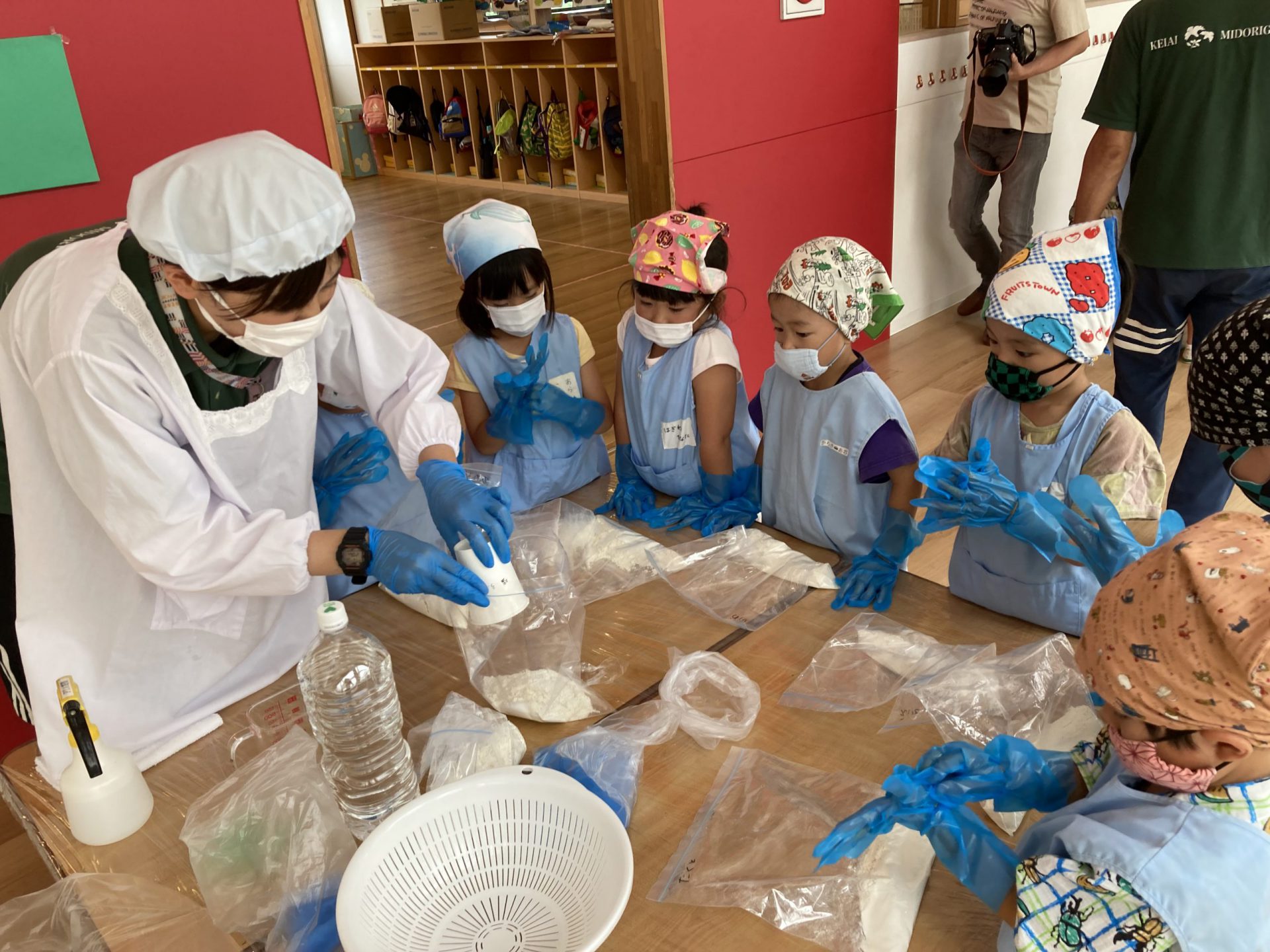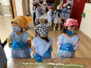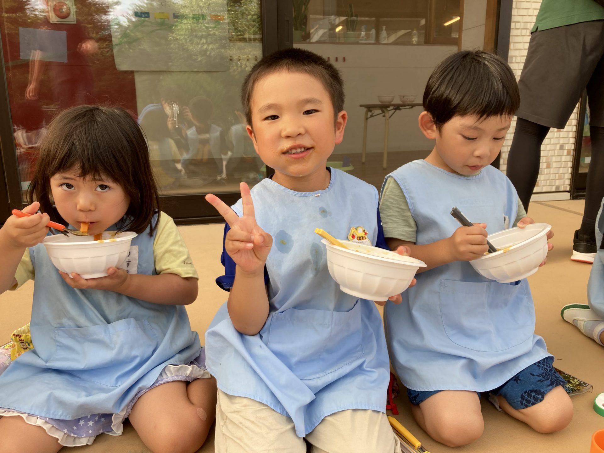 今年の年中さんは、うどん作りに、スイカ割り、キャンプファイヤーに花火を行いました。