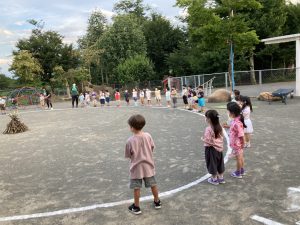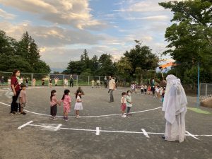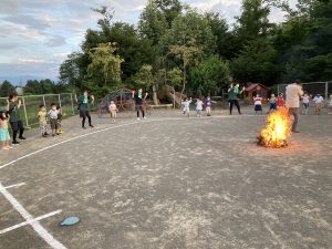 その後、園庭にて、火の神様から火をつけてもらい、キャンプファイヤーを囲んで楽しくダンス!!