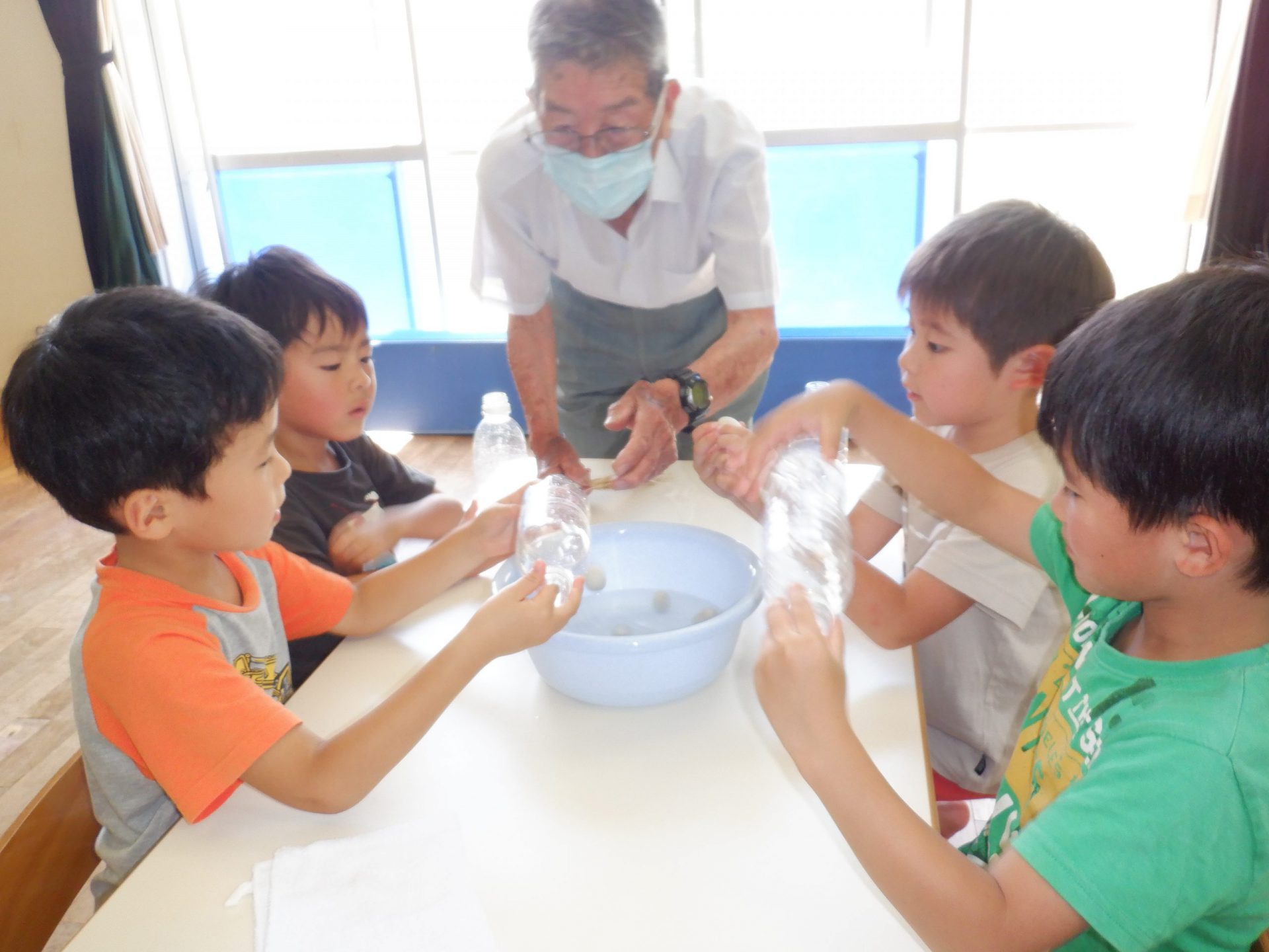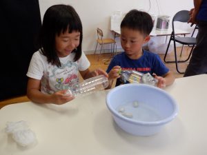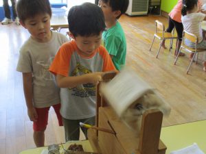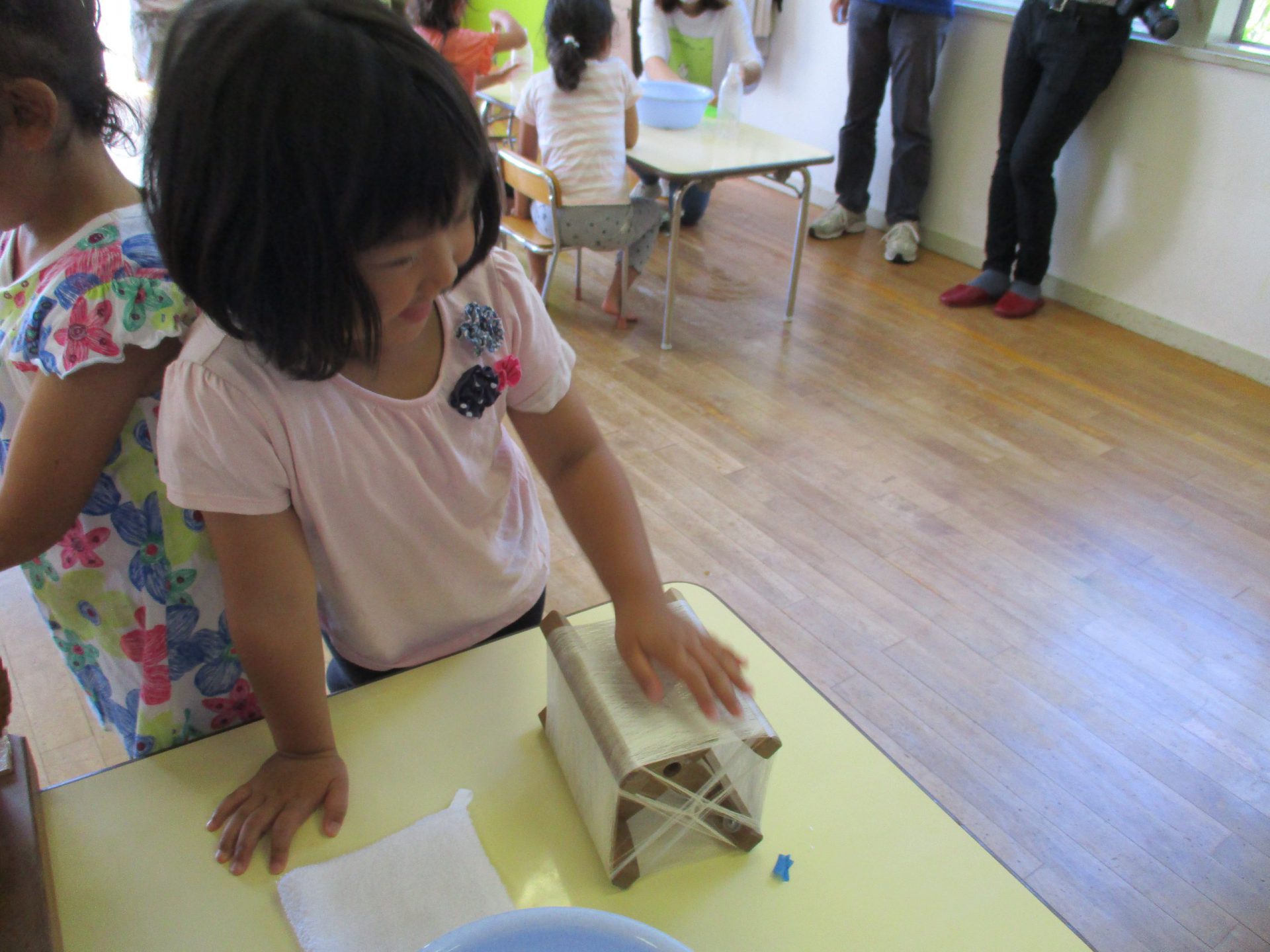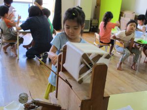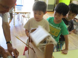 糸引きの順番が来るまで子ども達が飽きないようにと・・繭から糸をつまみ出してペットボトルに巻きつけるという遊びを 、金勝先生が提案してくださいました。