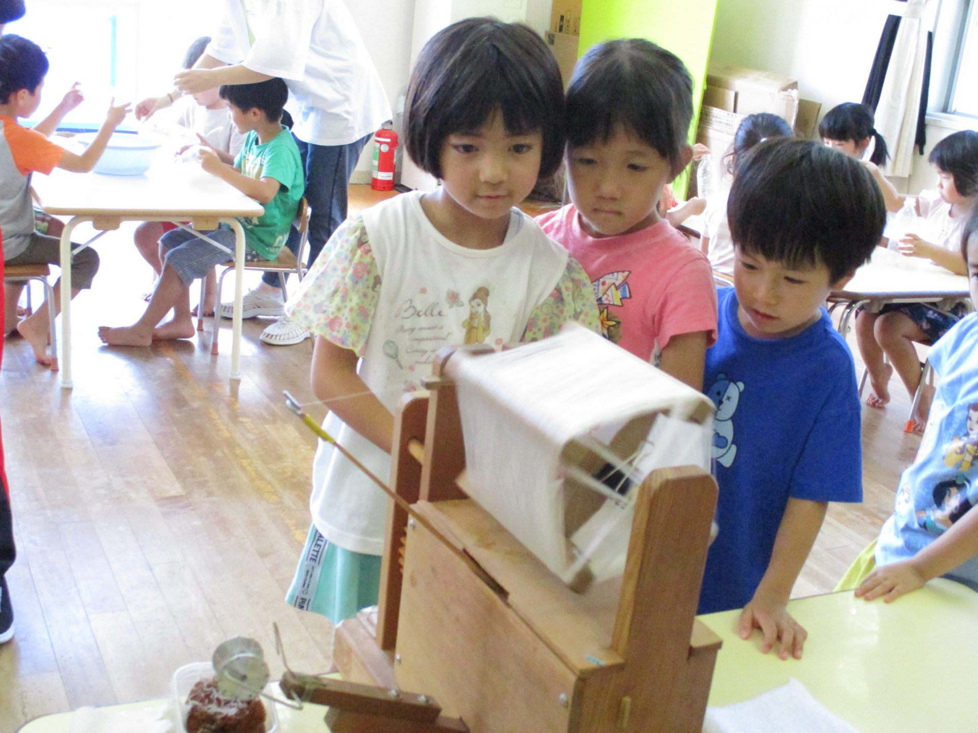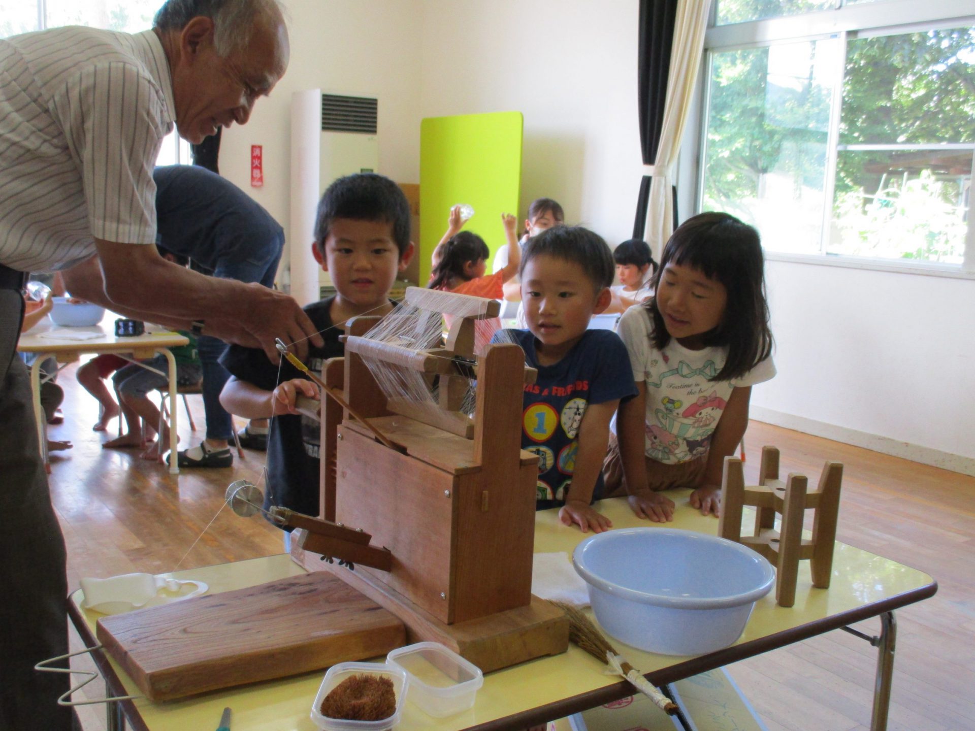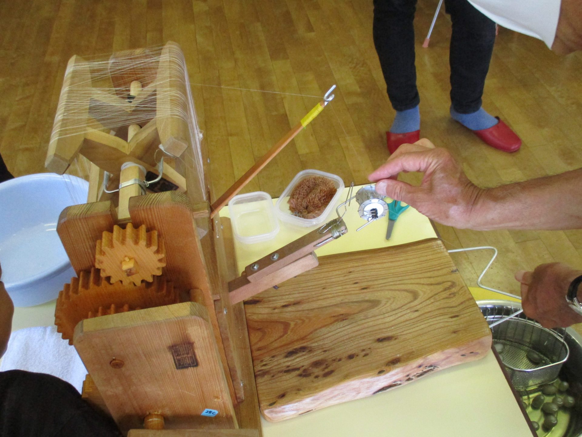 とても小さかったおかいこさまが、みんなで取った桑の葉を食べ、すくすくと大きくなり、糸を吐いて繭になる様子を実際に間近で見てきた子ども達・・・ そしてその繭から糸になるところを、滅多に触れることのできない貴重な「座繰り機」を使わせてもらいながら見て触れて経験できたこと・・・ 子ども達にとって記憶に残る学びになったと感じます。