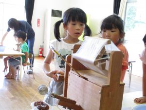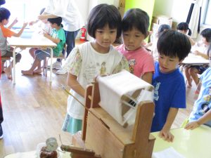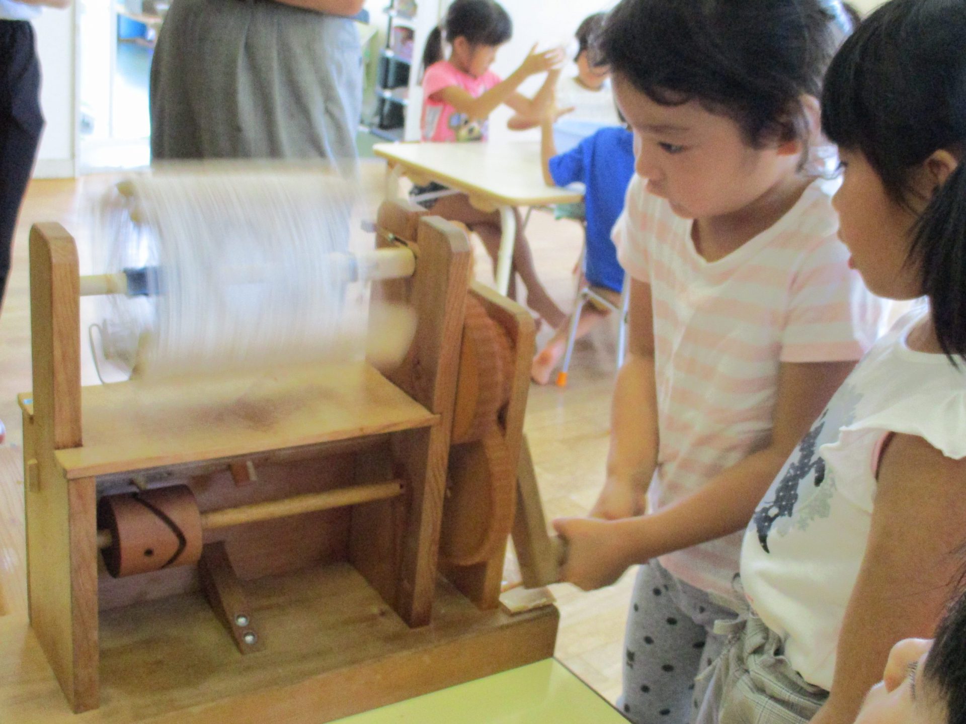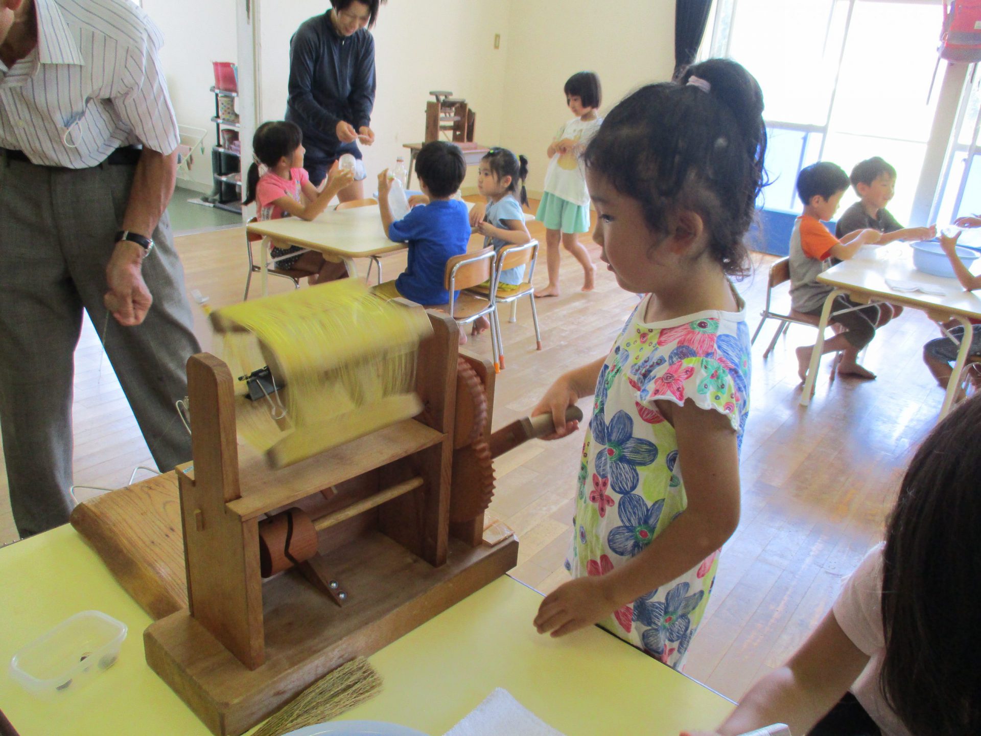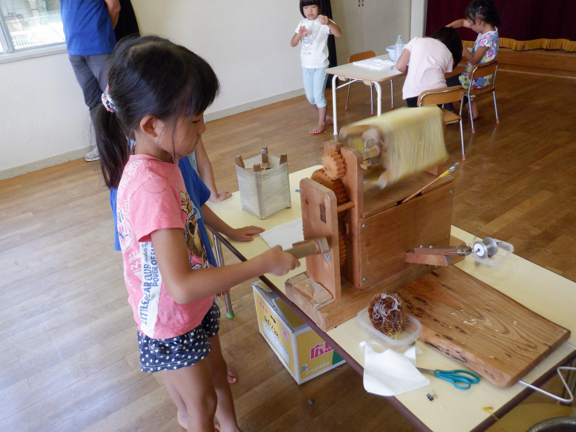 とても小さかったおかいこさまが、みんなで取った桑の葉を食べ、すくすくと大きくなり、糸を吐いて繭になる様子を実際に間近で見てきた子ども達・・・ そしてその繭から糸になるところを、滅多に触れることのできない貴重な「座繰り機」を使わせてもらいながら見て触れて経験できたこと・・・ 子ども達にとって記憶に残る学びになったと感じます。