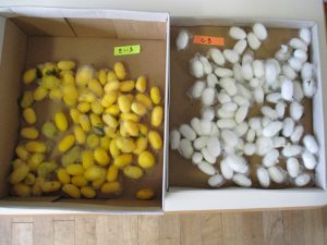 みんなで数えてみると、黄色の繭が80、白の繭が85 ありました。