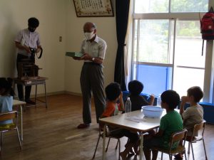地域の小山さんも糸引きの様子を見に来てくださいました。(一昨年度からの小山さんとの交流を通し、昔の真島について知ることができました。そして「蚕を飼ってみたい」という子ども達の気持ちが生まれたのでした。)
