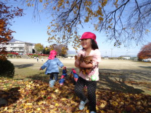 小学校の校庭の隅には大きな桜の木。その下には落ち葉がいっぱい!!