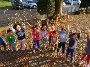 園庭の大きなけやきの木も葉を落とし、色とりどりの葉で、まるでじゅうたんの様。