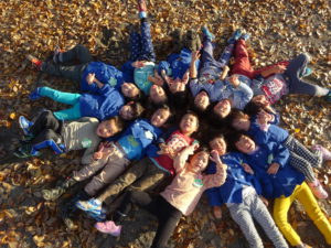 子どもたちは、落ち葉を集めて空に向けて投げ、パラパラ落ちるのを楽しんだり、落ち葉のベッドに寝転んだり。