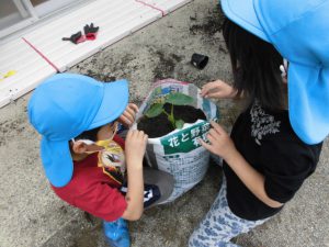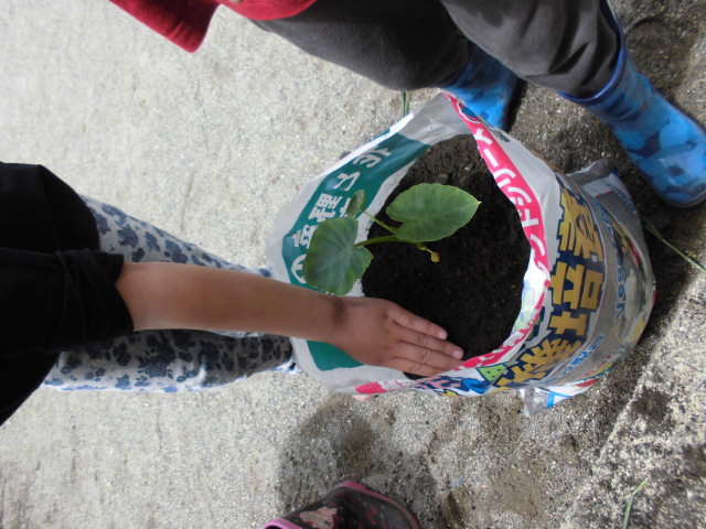 肥料袋に土を入れて、大事に植えました。