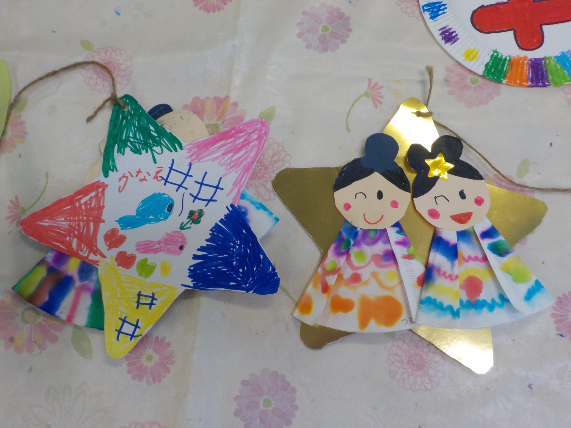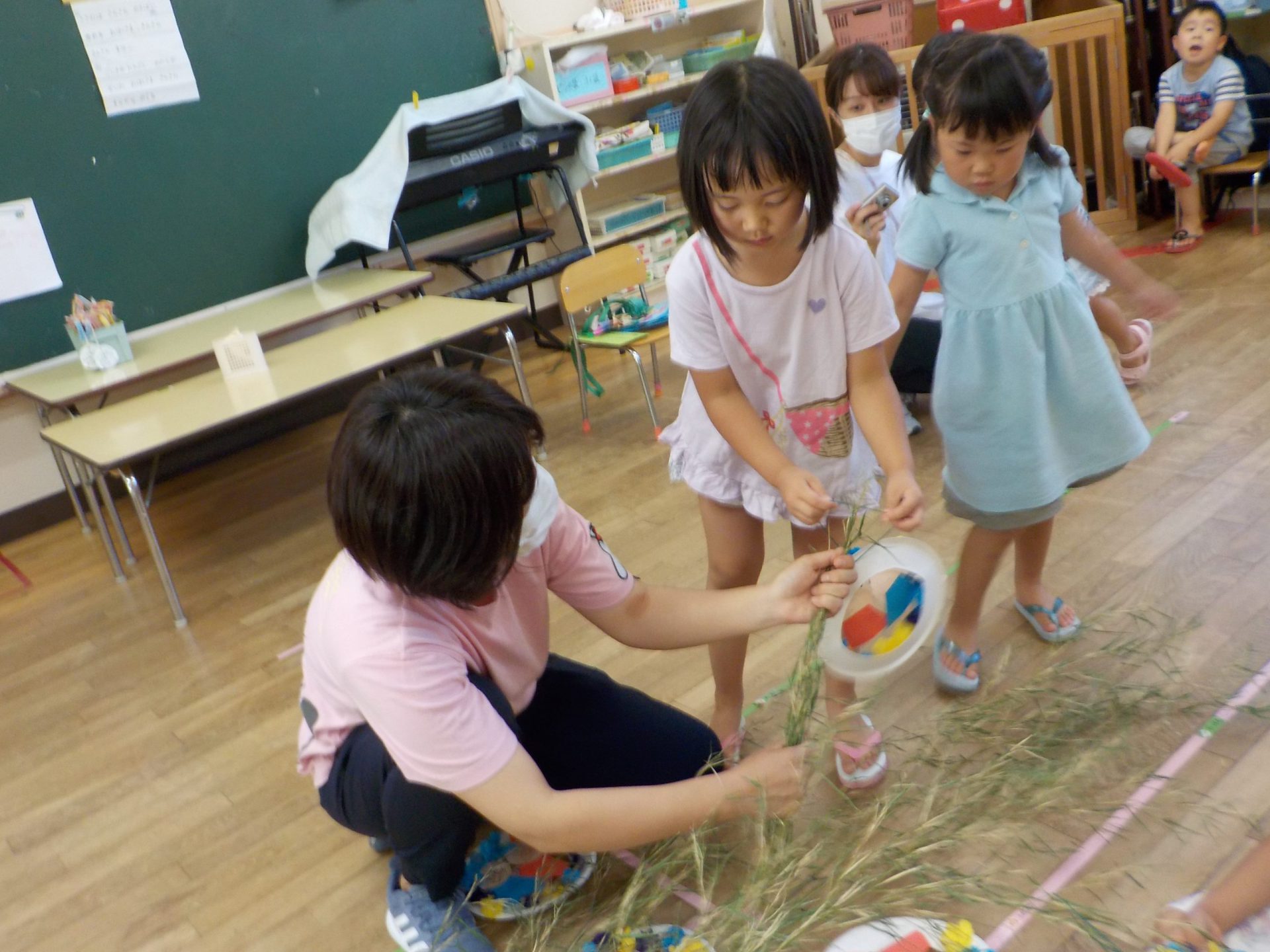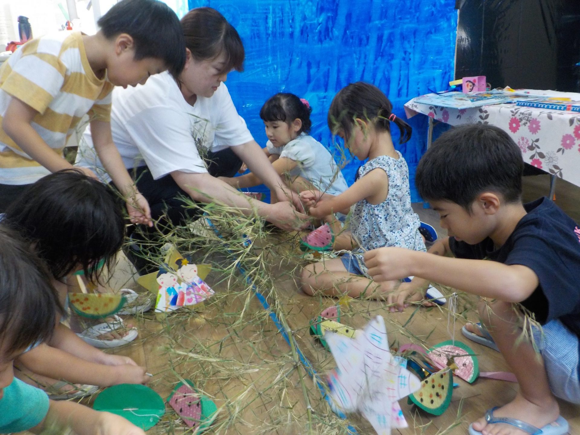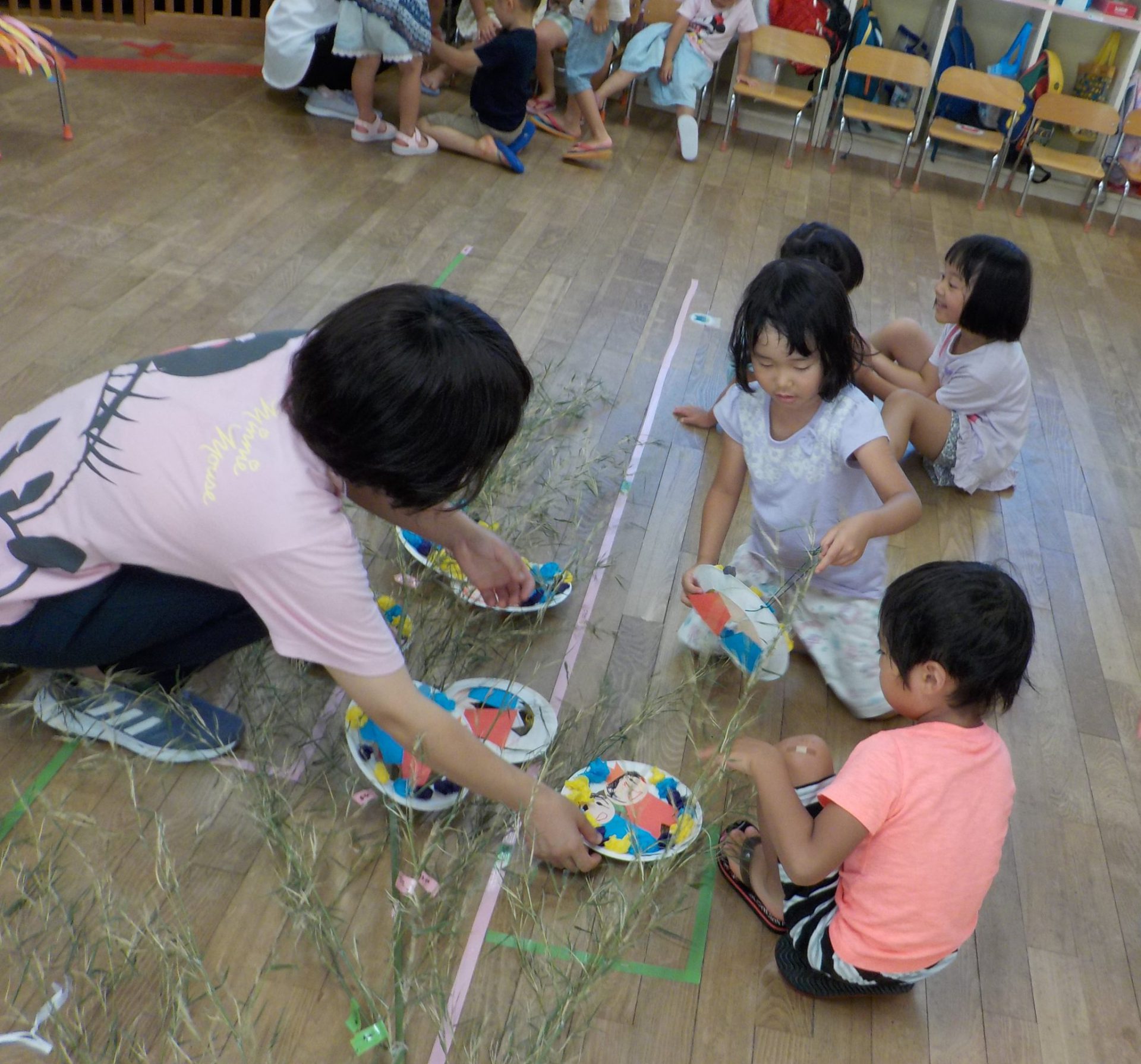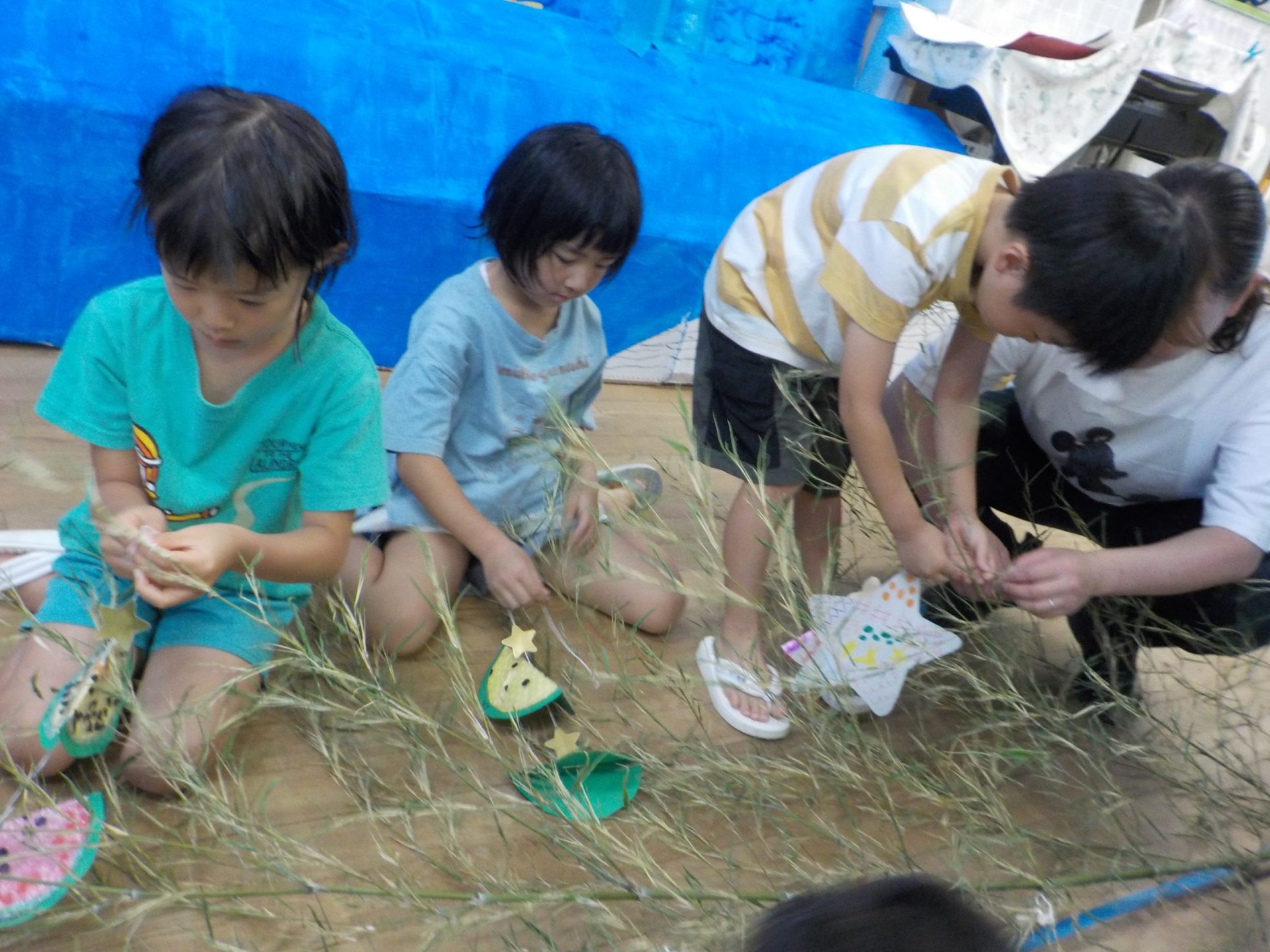 保育園では、笹が来るのを待っていた年中さん達が、自分で作った七夕飾りや願い事を括りつけます。