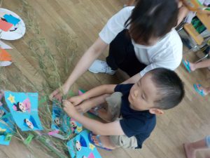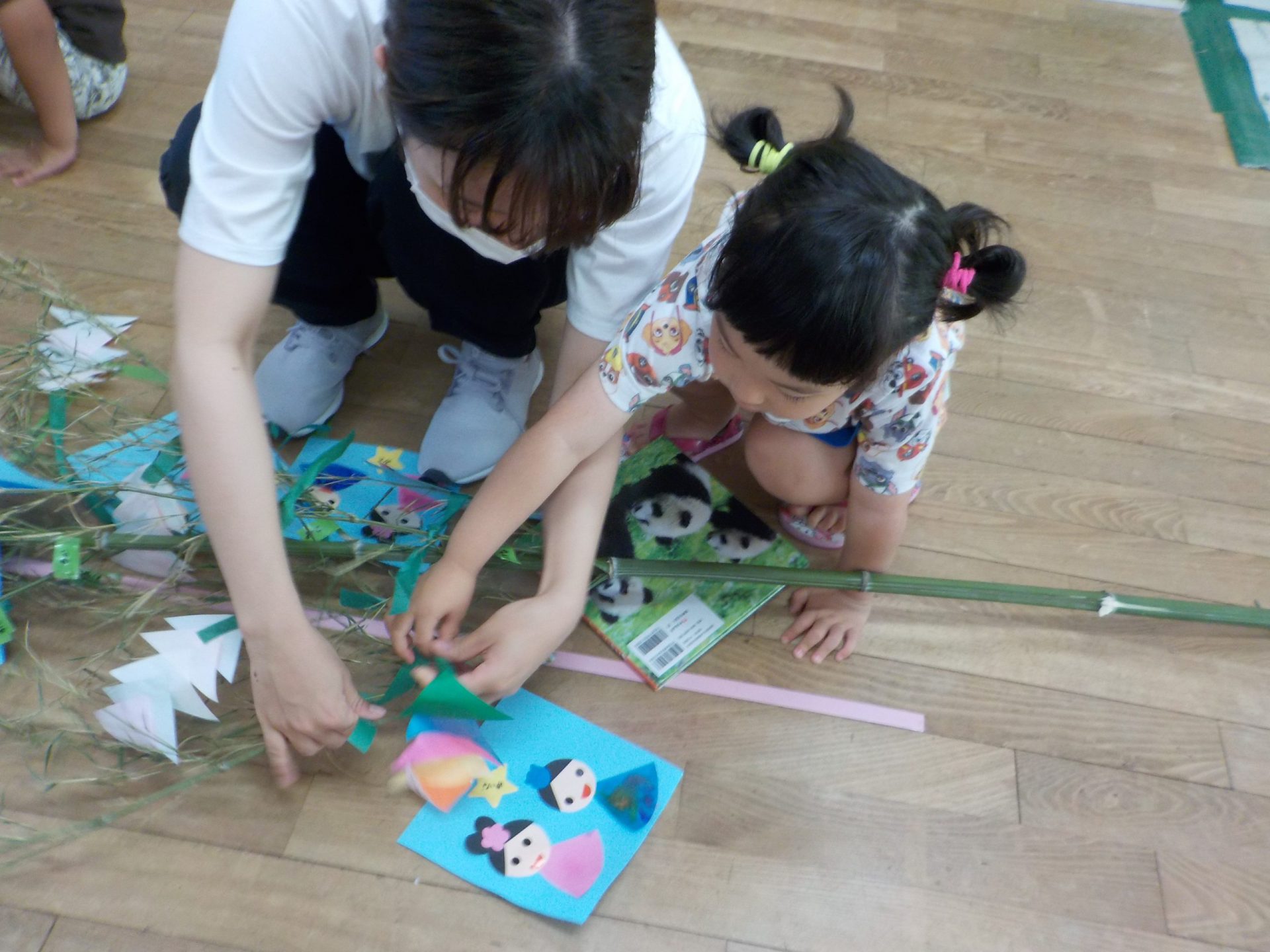年少さんは、保育士と丁寧に七夕飾りを付けます。