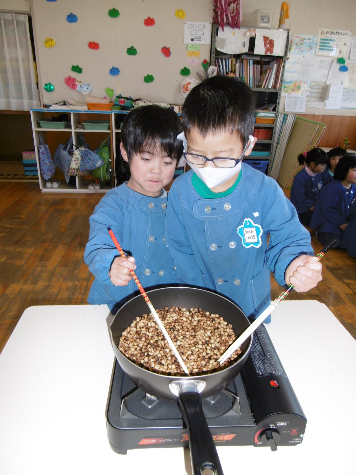 《節分当日》 収穫した大豆を豆まき用にフライパンで煎る。
