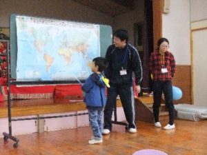 「アメリカはどーこだ?」「ここかな~」アメリカならわかる子もいます。