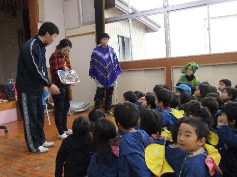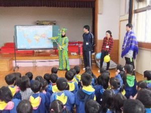 駒ヶ根市には西駒の近くに青年海外協力隊の訓練所があり、数十年前から保育園児との交流を行っています。年に4回ありますが先日、今年度最後、第4次隊の皆さんとの交流がありました。1日目は各クラスに入って子どもたちと自然の中で遊び、2日目は赴任国の紹介をしてくれました。