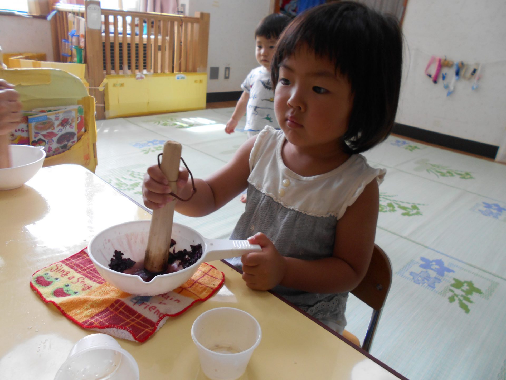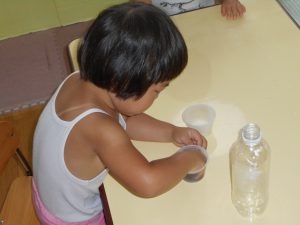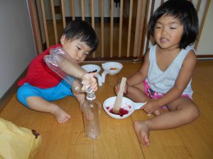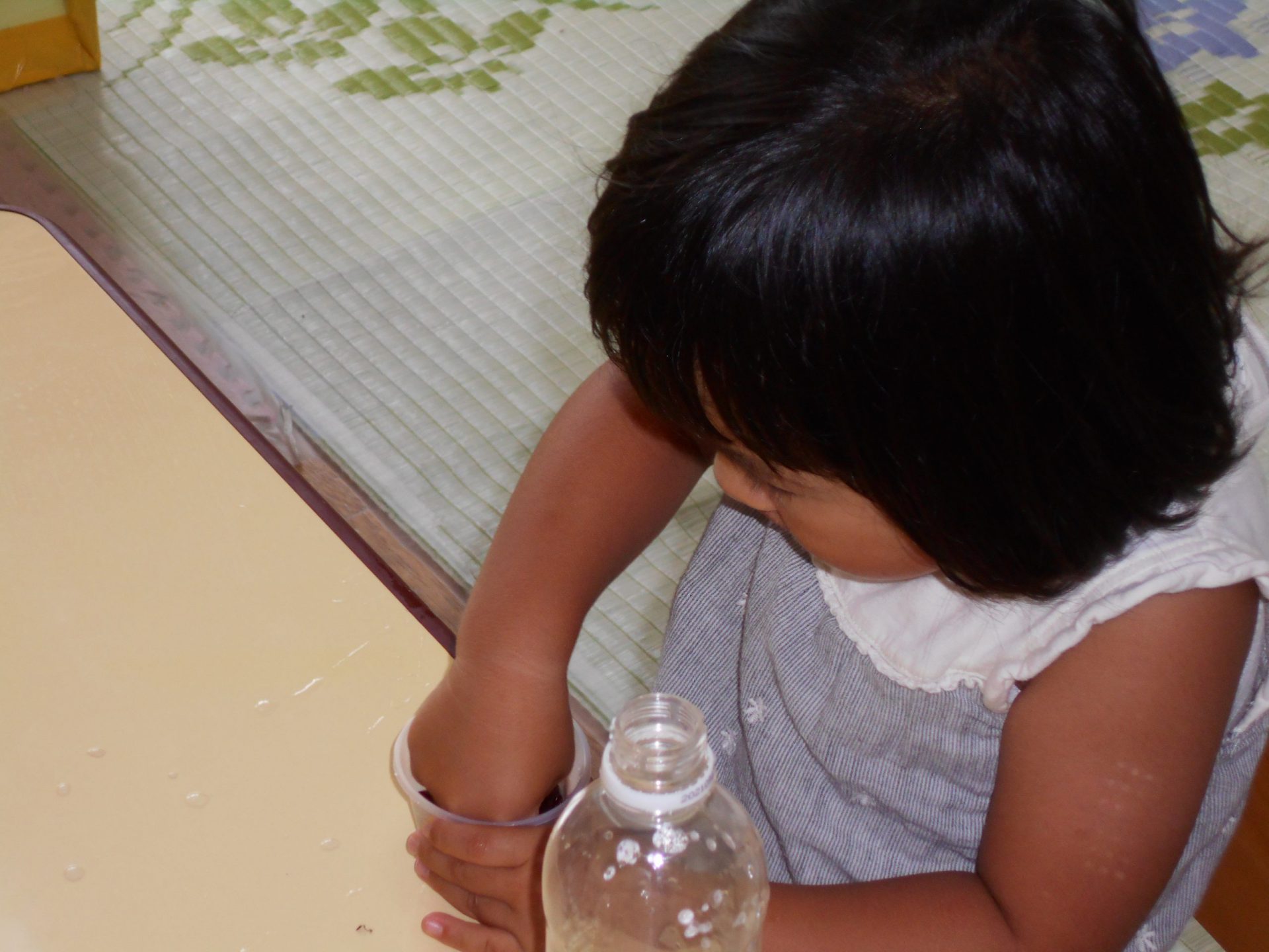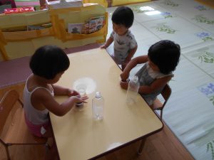 未満児でも、じっくりと実験をやっていた子どもたちの姿にビックリしました。ずいぶん長い時間集中してやっていたので驚くと同時に、面白いと思うと保育士が何か言わなくても自分たちでどんどん進めていく姿にたくましさを感じました。