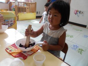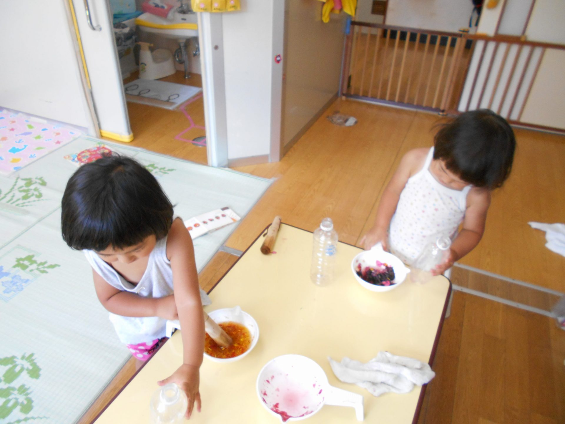花だけつぶしても色が出ないことに気づいた子どもたち。以前庭で遊んでいたときに、葉っぱを潰して葉っぱジュースを作ったことを思い出しました。その時に水を入れていたことを思い出し、 「みずをいれて!」 と水を入れだしました。たくさん入れると色が薄くなってしまったので、慎重に少しずつ入れては、色を確認していました。