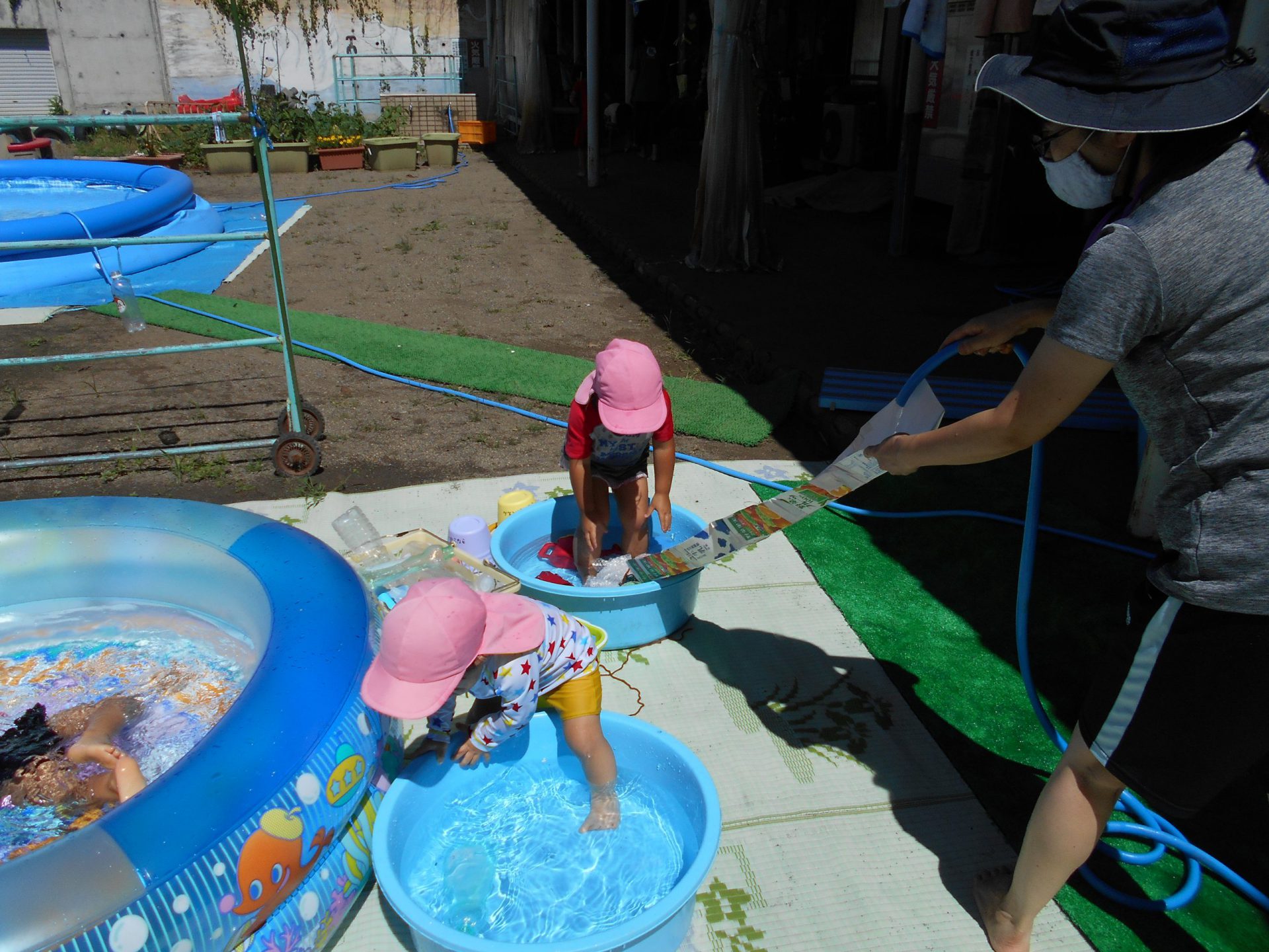 流しそうめんごっこに突入! 「これもながそうよ!」「これも!」 そうめん(毛糸)、魚、ペットボトルなどなど、いろんな物が流れたよ☆