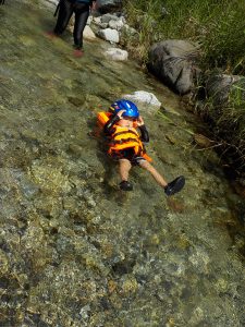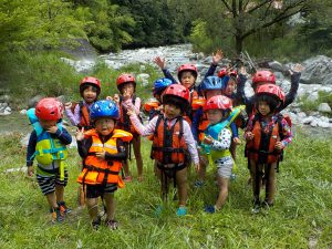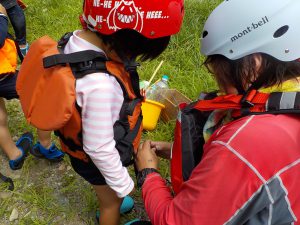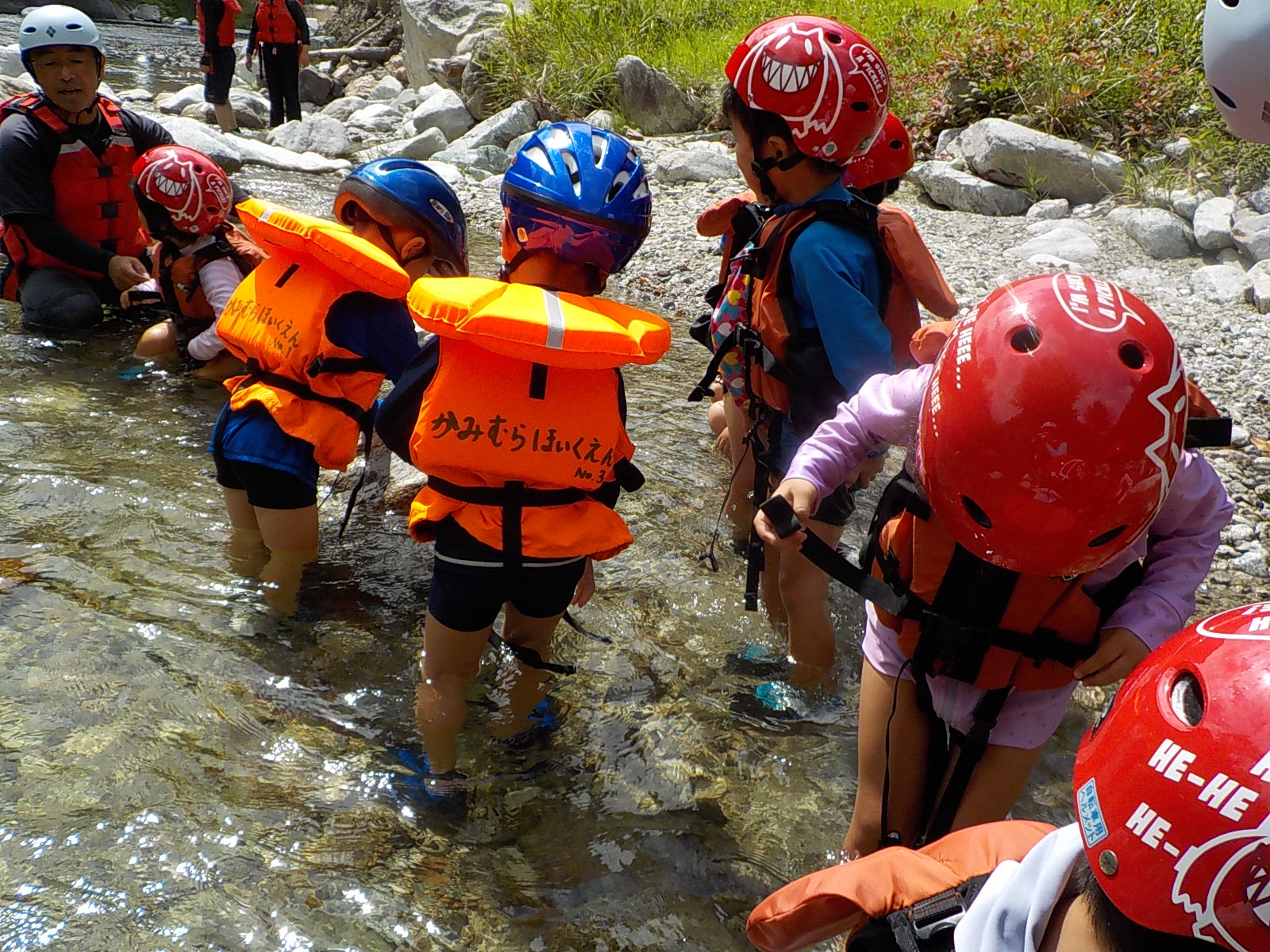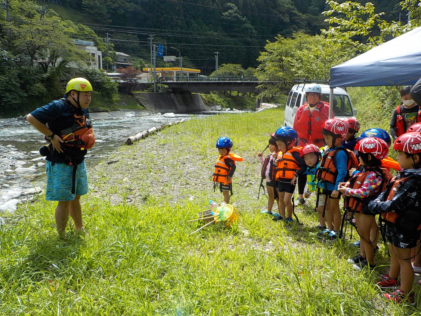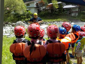 今年度は全員の職員が川遊びの前に、川遊びの指導者の資格を持つ伊藤さんから、安全な川遊びについての講習を受けました。せっかくの楽しい遊びも事故やケガがあっては何にもなりません。きちんとした支度をして遊ぶのは、安全に遊ぶことはもちろんのこと、保護者や子どもたちに意識してもらうことも目的としてあります。子どもたちの好奇心はときによって自分の身を守ることを忘れてしまいます。子どもたちが楽しく安全に遊べたか、振り返りをして次回の沢遊びの計画を立てていきたいです。