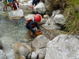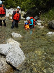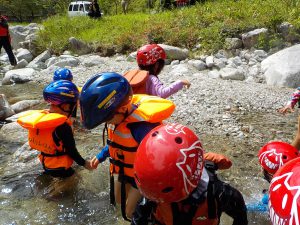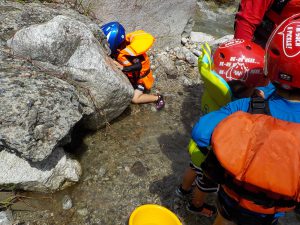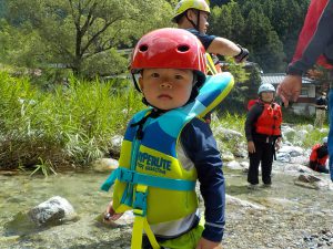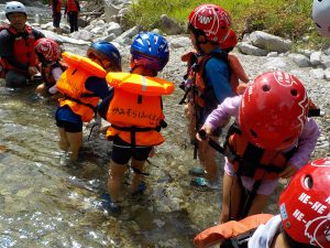 3つの約束「ライフジャケット、ヘルメット、靴は川の中では絶対脱がない」「上流下流の先生が立っている先には行かない」「笛が聞こえたら遊びをやめて川から上がる」。しっかり聞いていました。