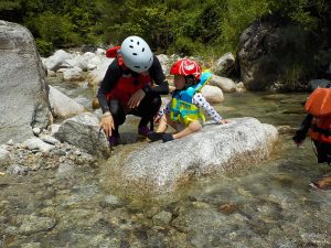 今年も沢遊びの季節になりました。今日はお隣の地区の和田保育園の以上児さんも遊びに来てくれました。一回目ということで和田にある「遠山郷探検隊」の代表、伊藤誠智さんが沢遊びでの安全な遊び方やルールを子どもたちに教えてくれました。