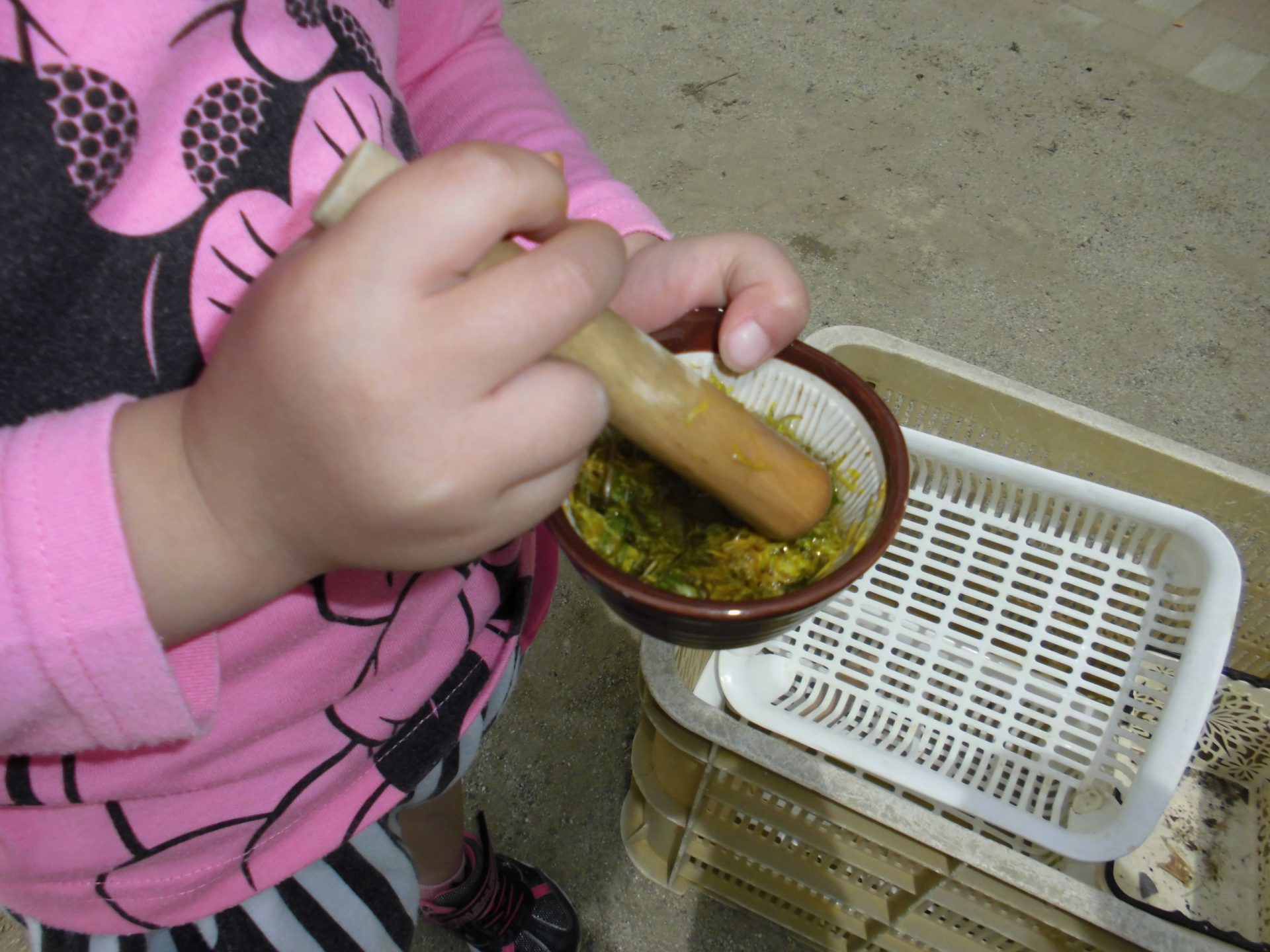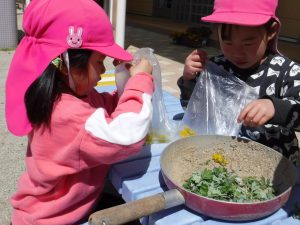 年中さんが すり鉢でたんぽぽをすりすり・・・