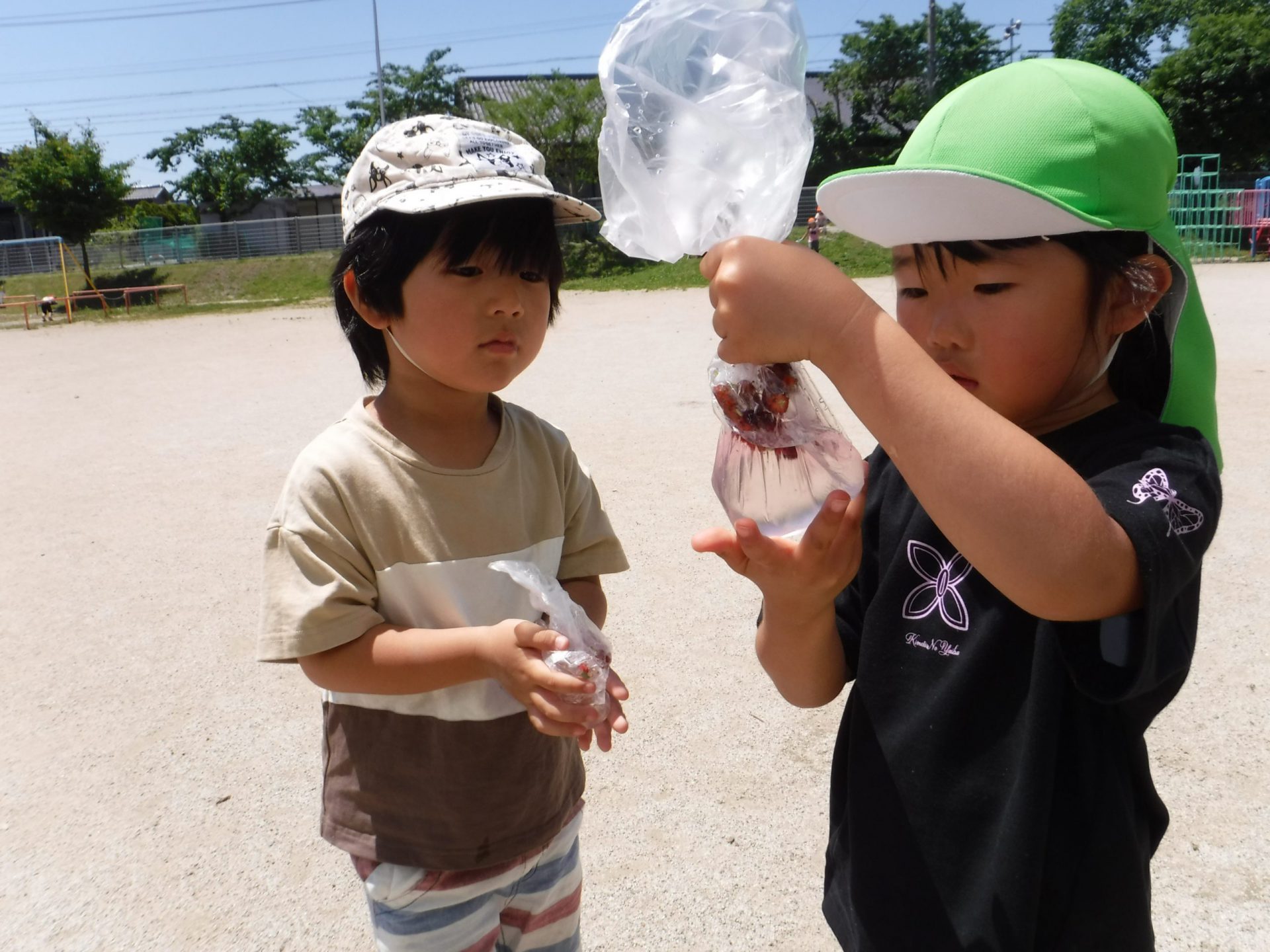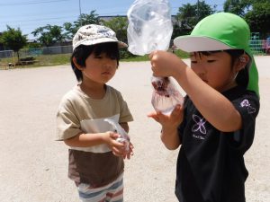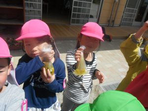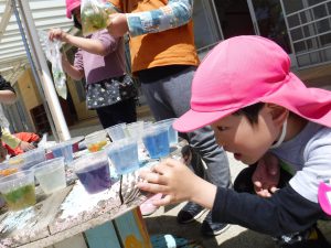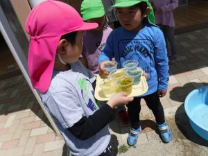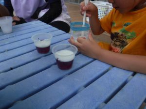 作ったあとにジュースやさんごっこをしたり お家の方に見せたいと楽しみにしていたら色が変わって「あれ?」と不思議がったり・・・