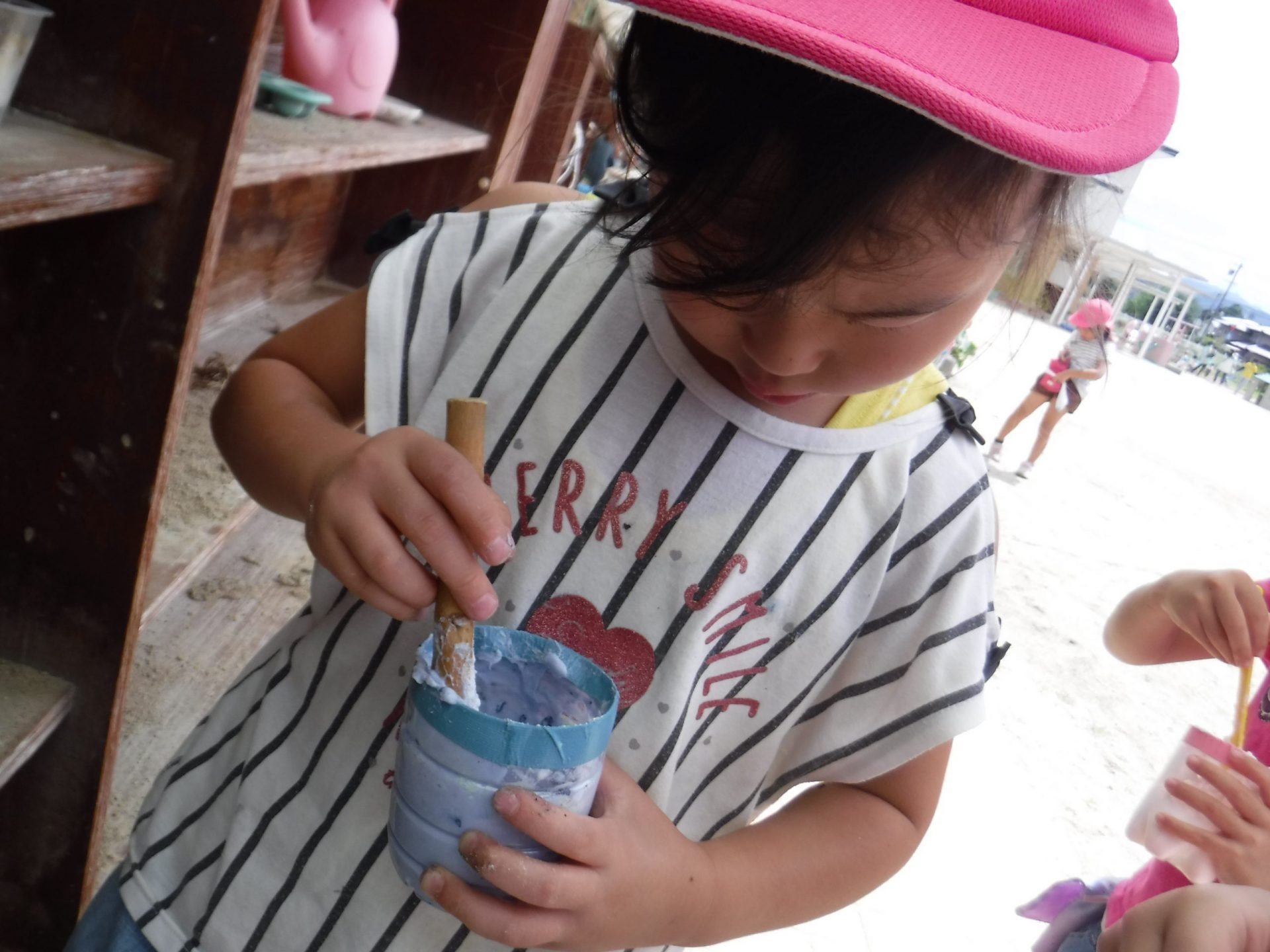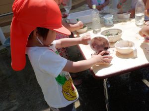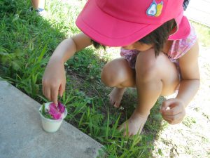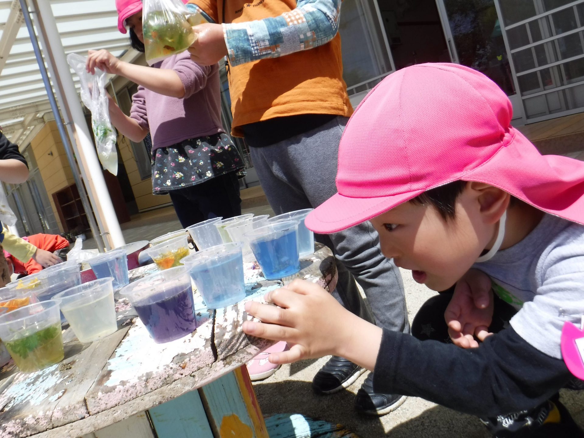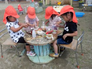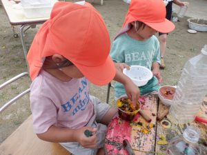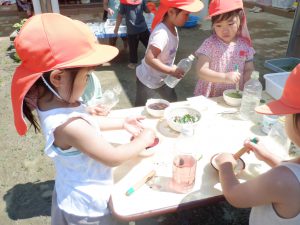 園庭の草花・プランターで育てた花・・・それらを使って年長さんが作っていた色水を見て 年中・年少さんもやってみたくなってやり取りが始まりました。