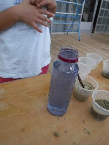 年長さんが 園庭の草花で遊び始めました。よもぎやたんぽぽで 色水ができたよ。