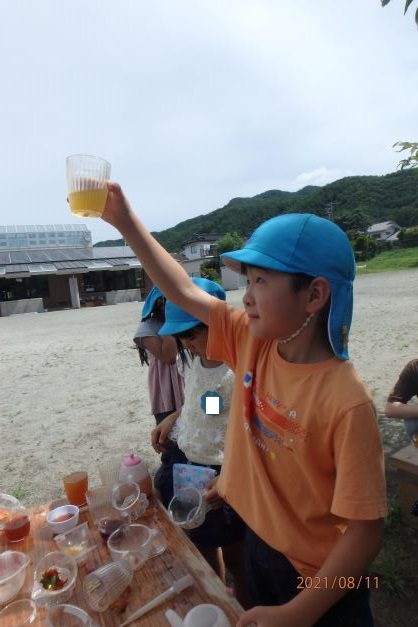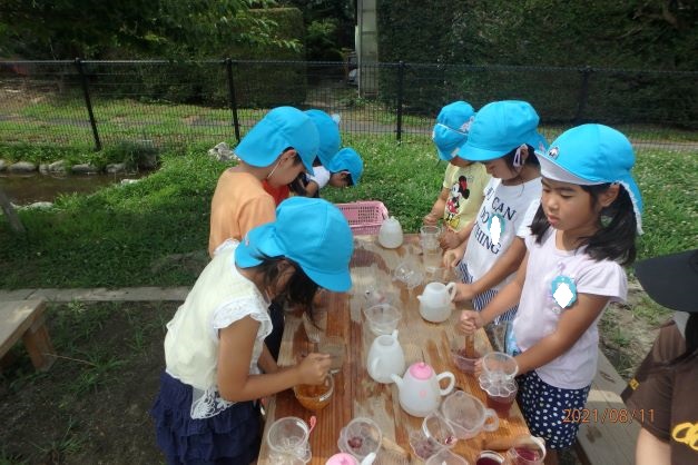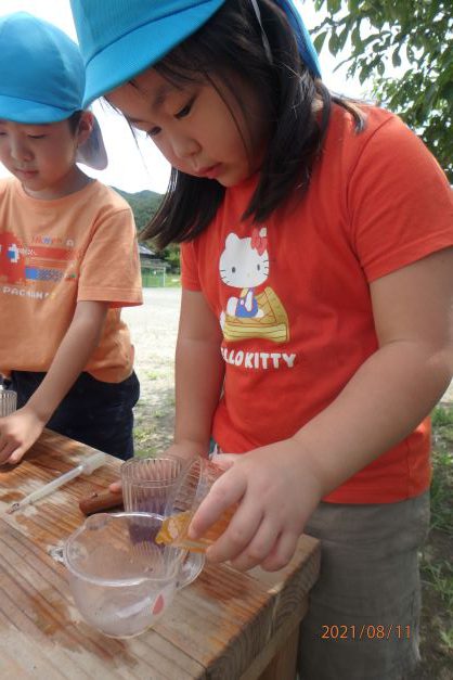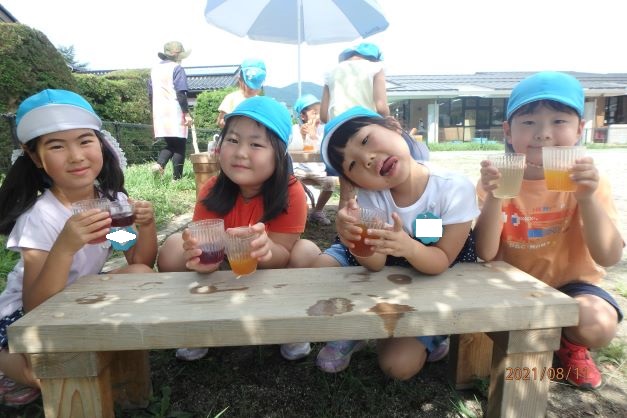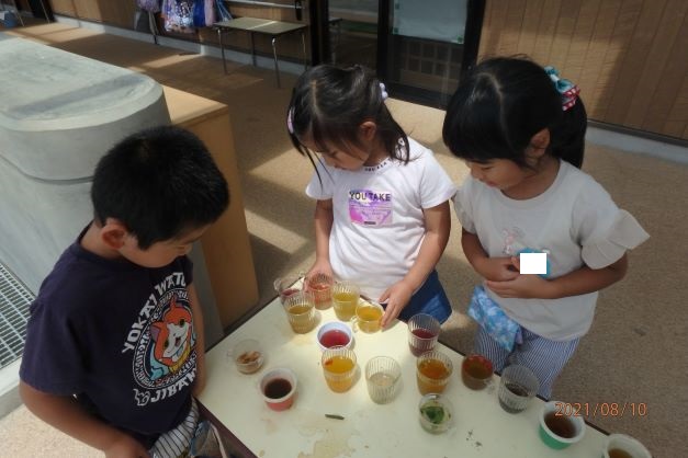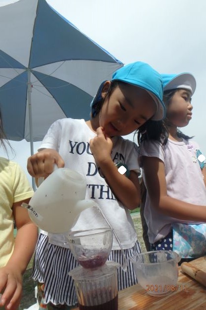 色々なジュースの出来上がり!花によって色水が違うんだ!