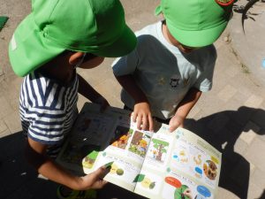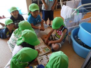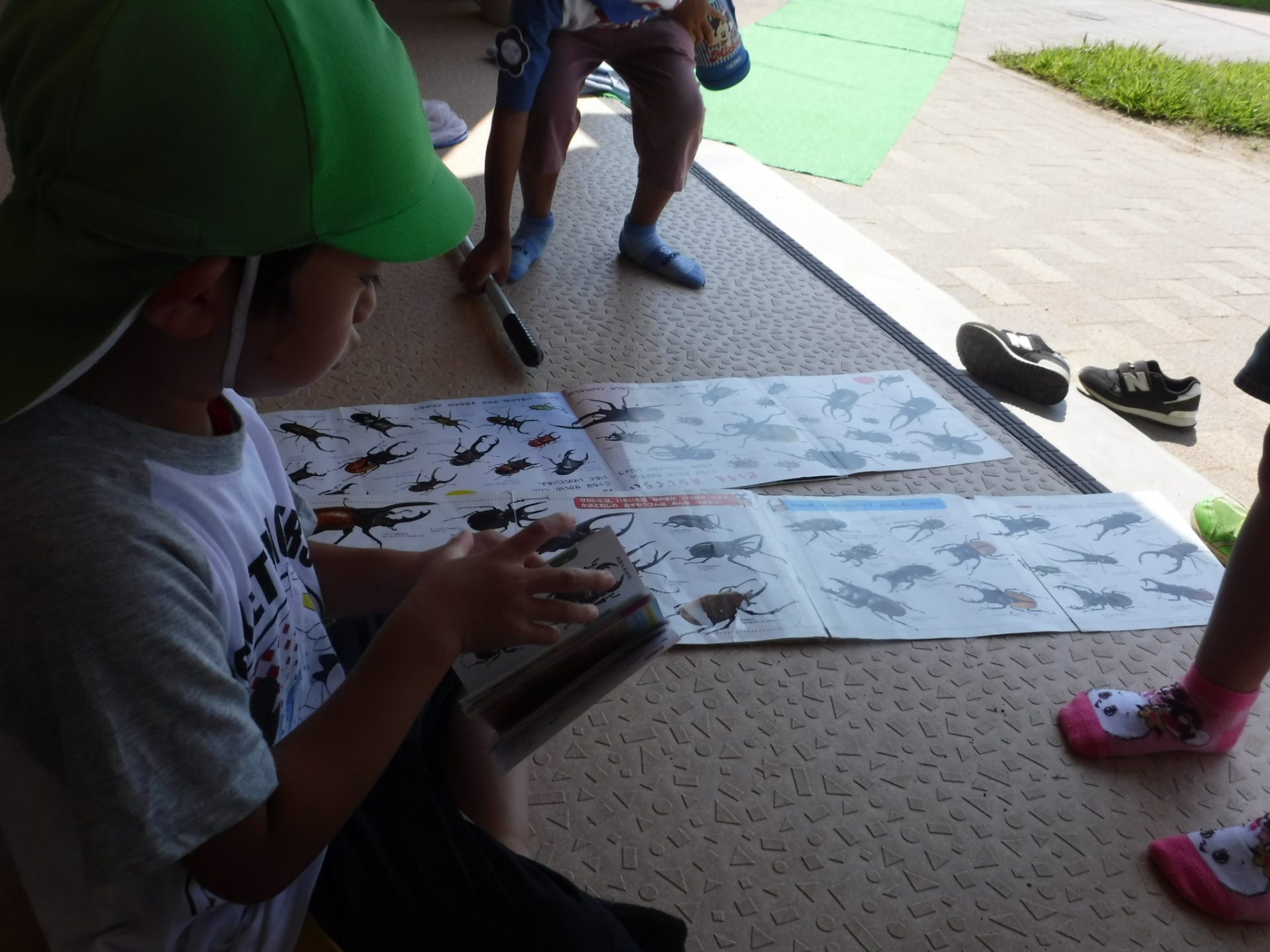 保育士が持ってきた図鑑に捕まえ方が載っていることに気付いた子どもたち。
