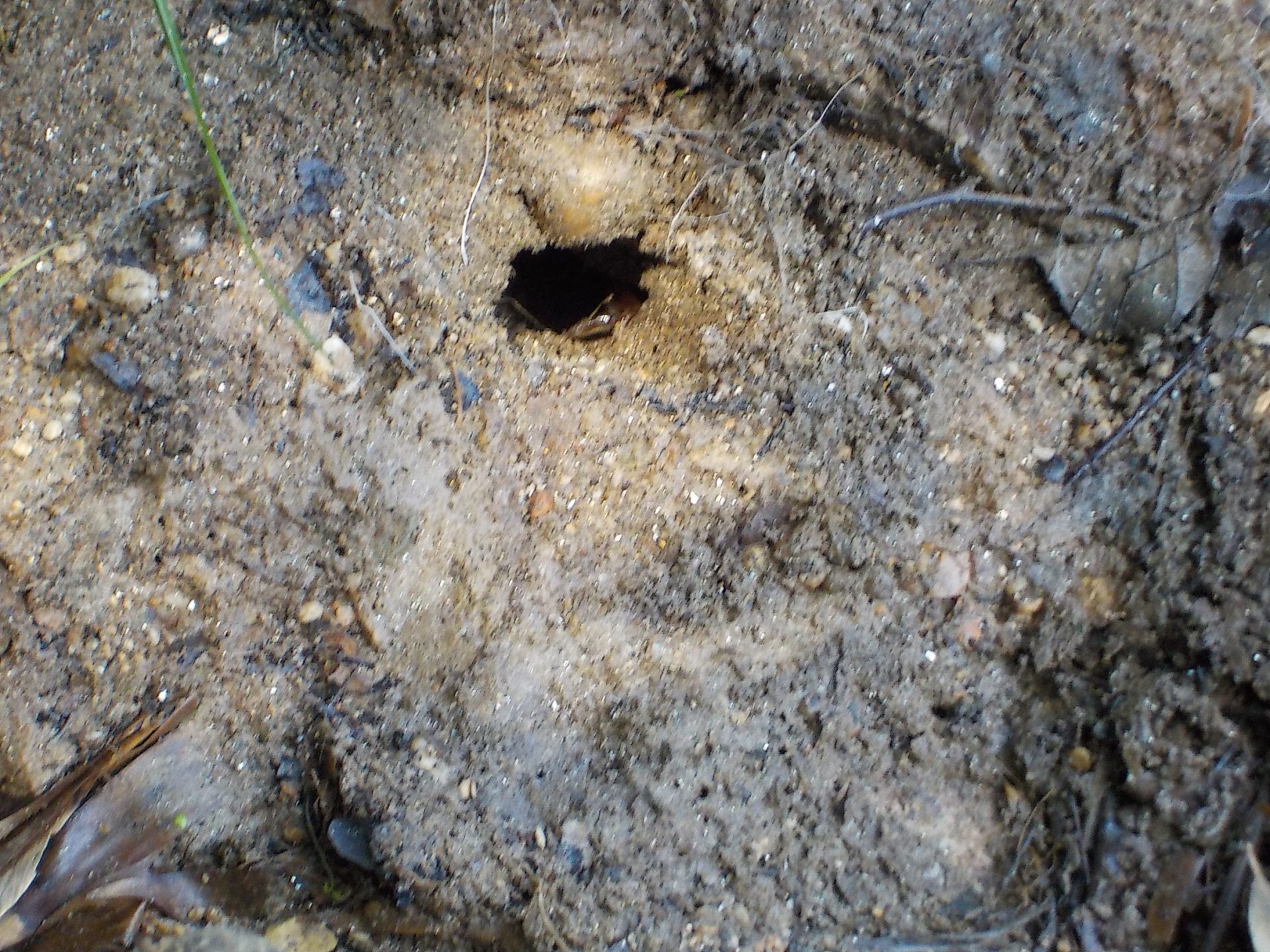 「カニの穴発見! 穴の中にカニがいるよ。見えるかなぁ・・・?」