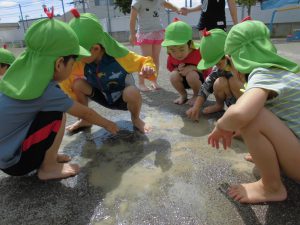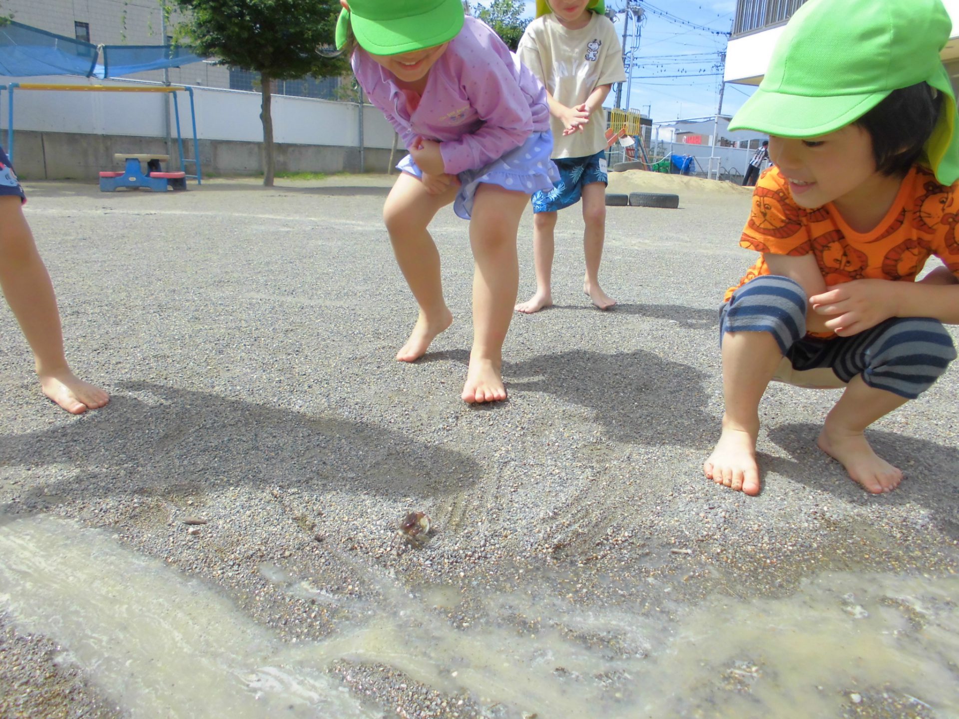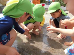 水遊びの時に思い切ってカニも一緒に園庭へ連れて行きました。