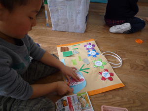 3歳児の子ども達も今まで描いた絵や作品を持ち帰るために作品袋を作りました。