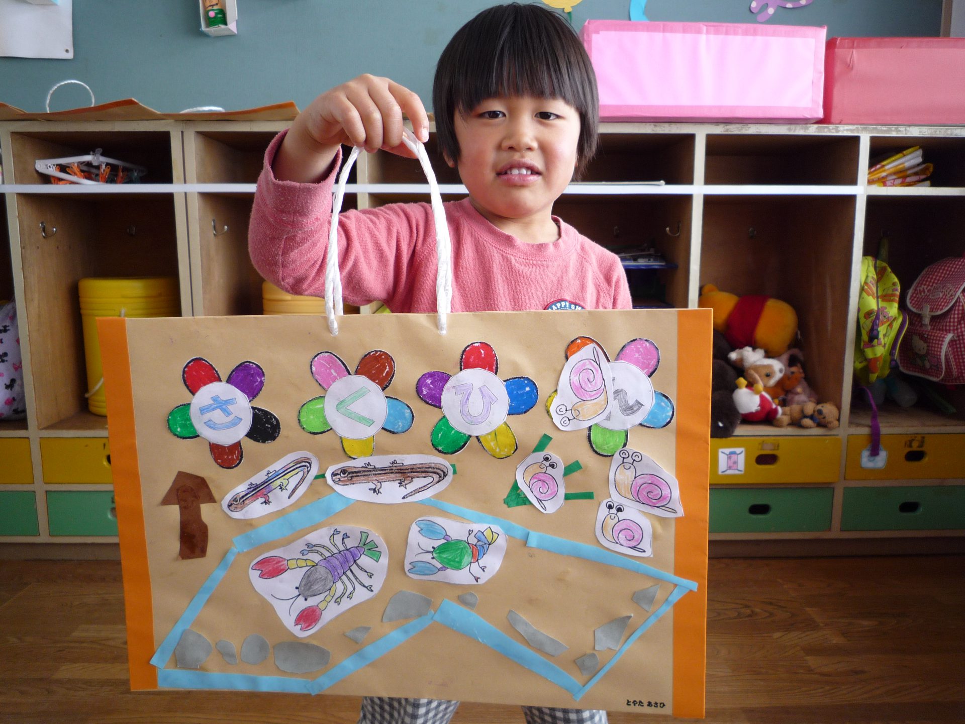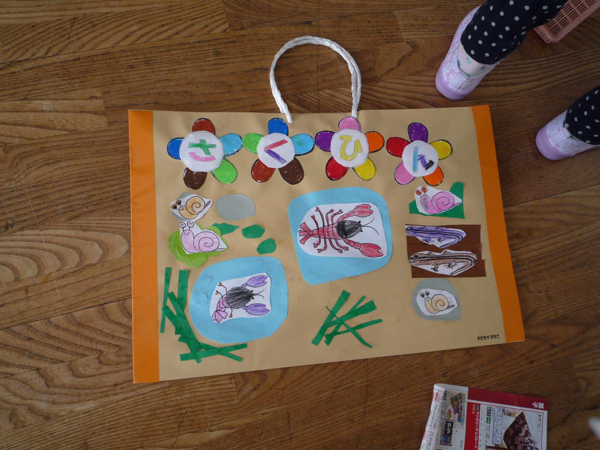春から大事に世話をしてきた生き物達の作品袋です。生き物達がどんな場所に住んでいるか誰よりも知っている子ども達なので、画用紙を石や草に見立てて切ったり、張る場所を工夫したりしながら一人ひとり違う素敵な作品袋が完成しました。