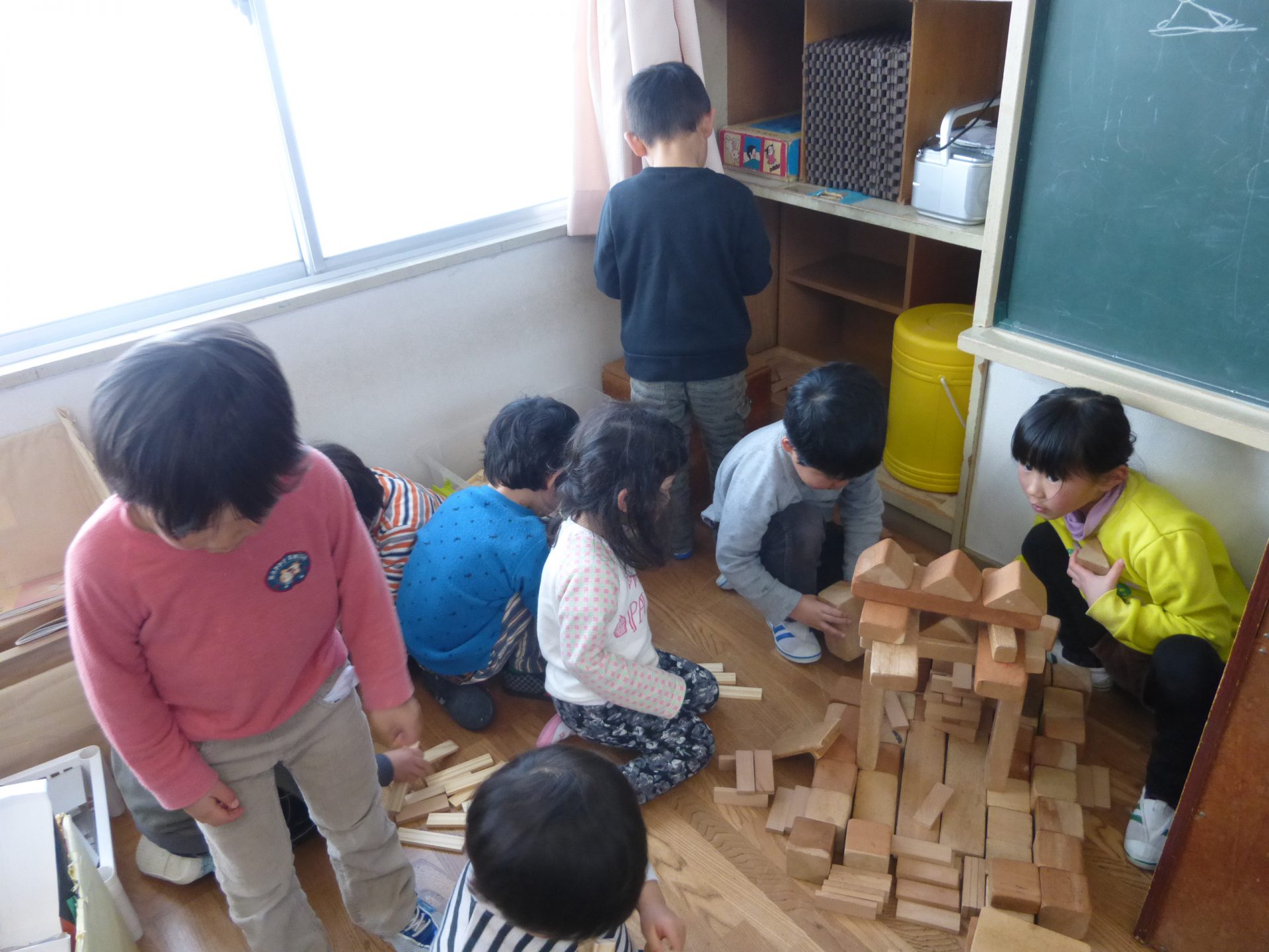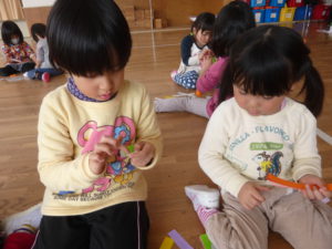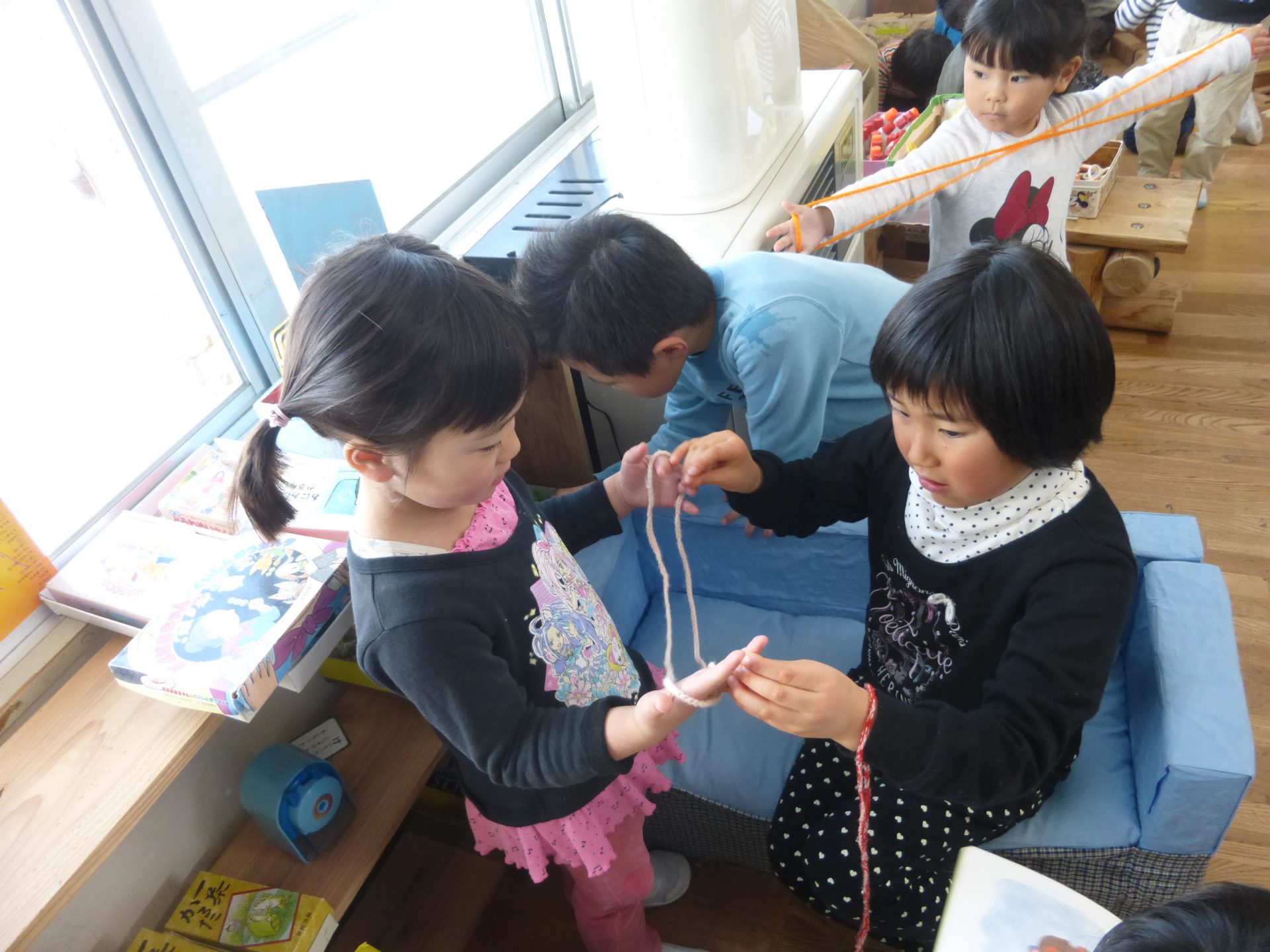 食べ終わった後もそれぞれの部屋で積み木やあやとりをして遊びました。