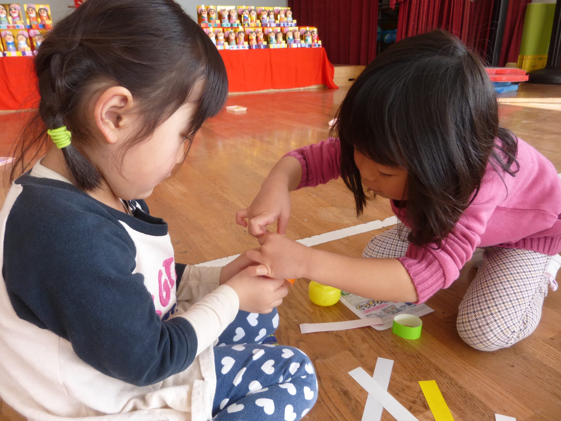 ペアでの作業は初めての経験なので、始めはお互いに緊張して顔も強ばっていた子ども達ですが4歳児が上手にリードしてくれるので段々と笑顔も見られるようになりました。