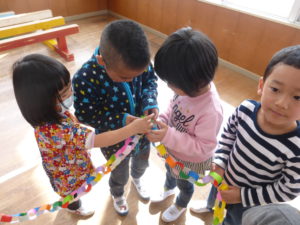 子ども達と相談して、4歳児が七夕飾りで作った輪つなぎを遊戯室に飾ることにしました。