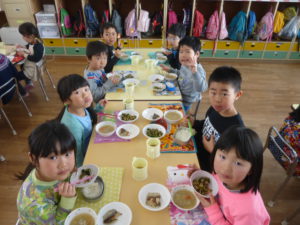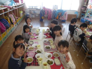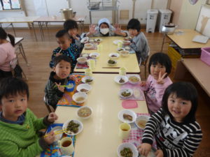 3月に入り5歳児がいるわずかな時間を大事にして週に1回「仲良し給食」を始めました。好きな部屋を選んで一緒に給食をいただきます。給食の量、食器の大きさの違いがとても新鮮です。5歳児は2年前に生活していた部屋に懐かしさを感じていました。