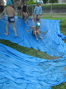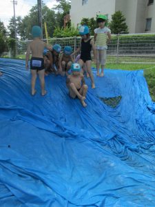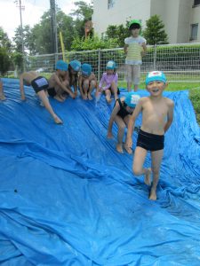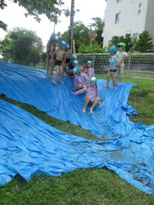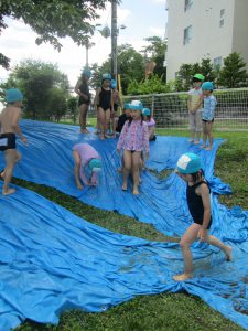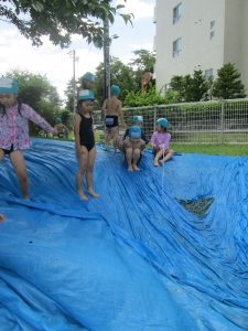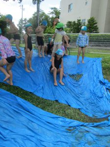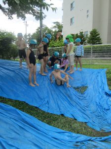 園庭の芝坂にブルーシートを敷いて、みんなでウォータースライダー遊び。