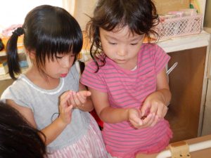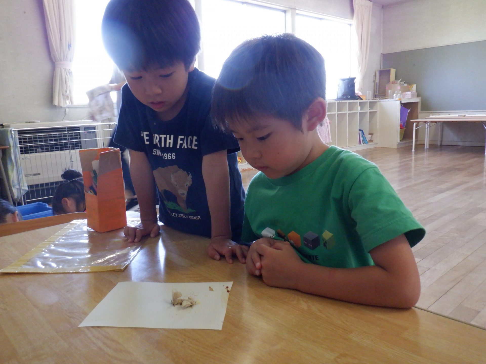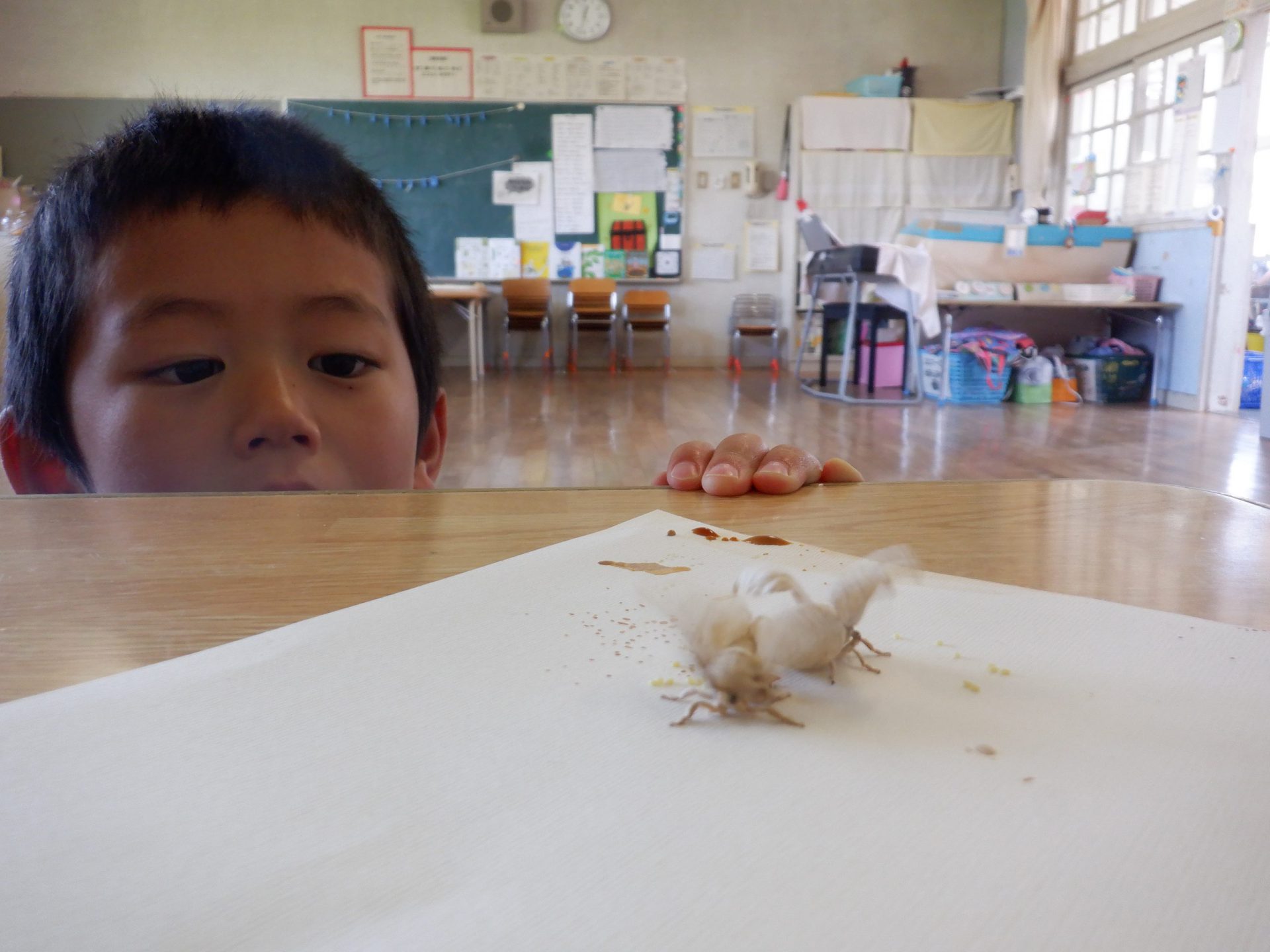 大きいのがメス、小さいのがオス、と教えてもらった子ども達は、