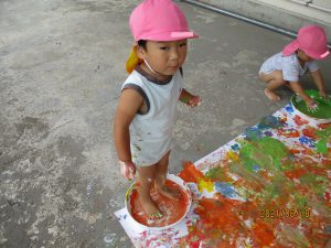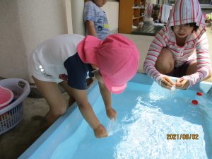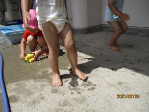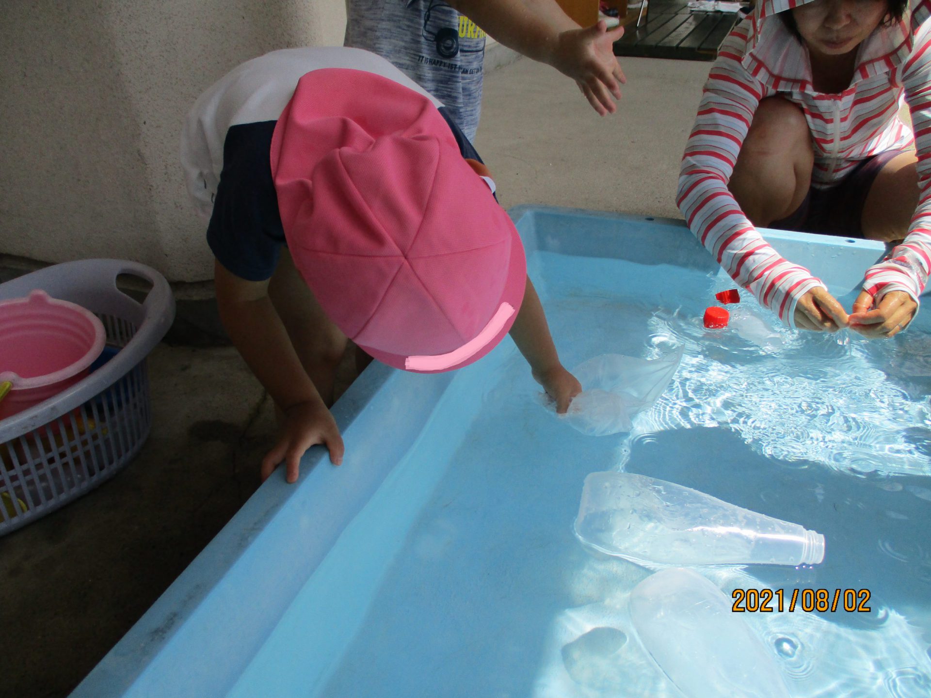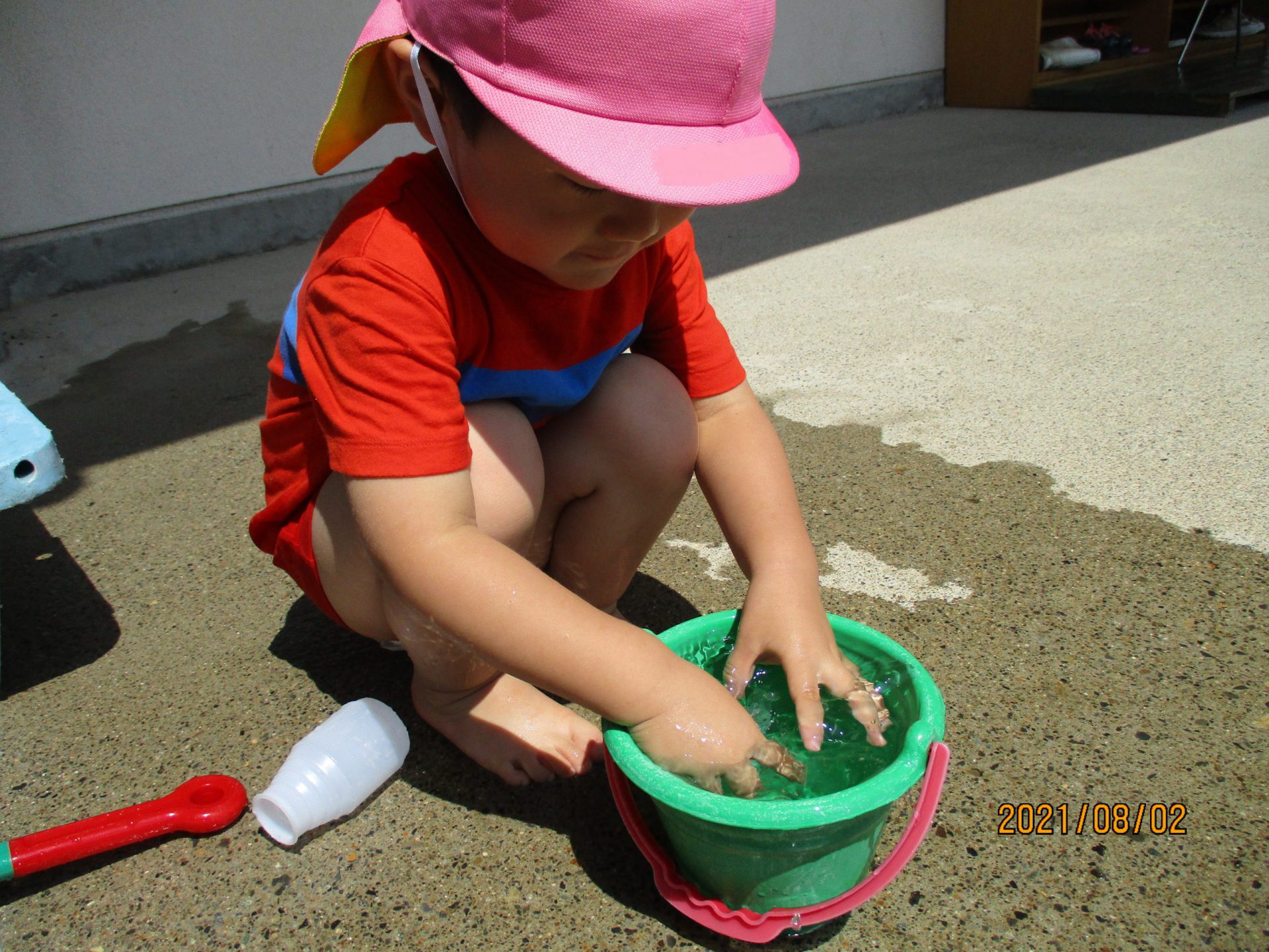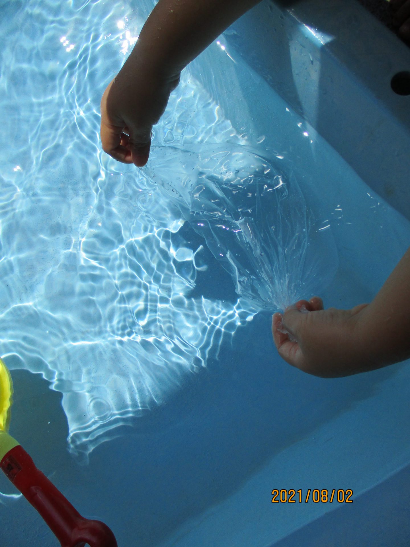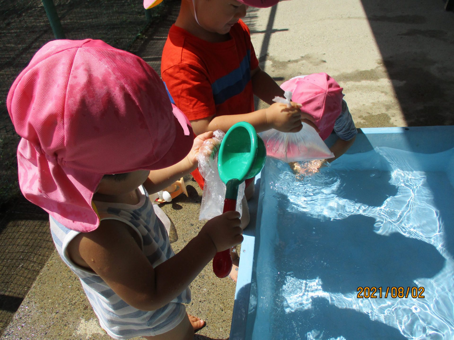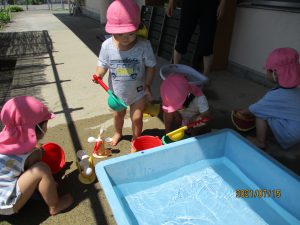 『水遊び』という遊びの中で、一人ひとりそれぞれ違った遊び方が見られました。ビニール袋一枚手にするだけでも、袋に水を入れて手で揉んで感触を楽しむ子、水を入れた袋をタライに落とし水しぶきを楽しむ子、袋をタライに入れてかき混ぜ袋探しを楽しむ子、水の入った袋の上でジャンプして袋が割れ水が飛び出すのを楽しむ子と、本当に様々でした。