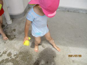 スコップで水をすくったり、スポンジでゴシゴシお風呂ごっこをしたり、水に触れながら楽しんでいます。