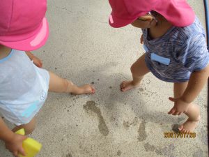 初めは玩具を用いて遊ぶ姿がよく見られましたが、遊んでいるうちに”足あと”に気がつき夢中になっていく姿が。「これ僕の足あと!」「これあたしの〜!」
