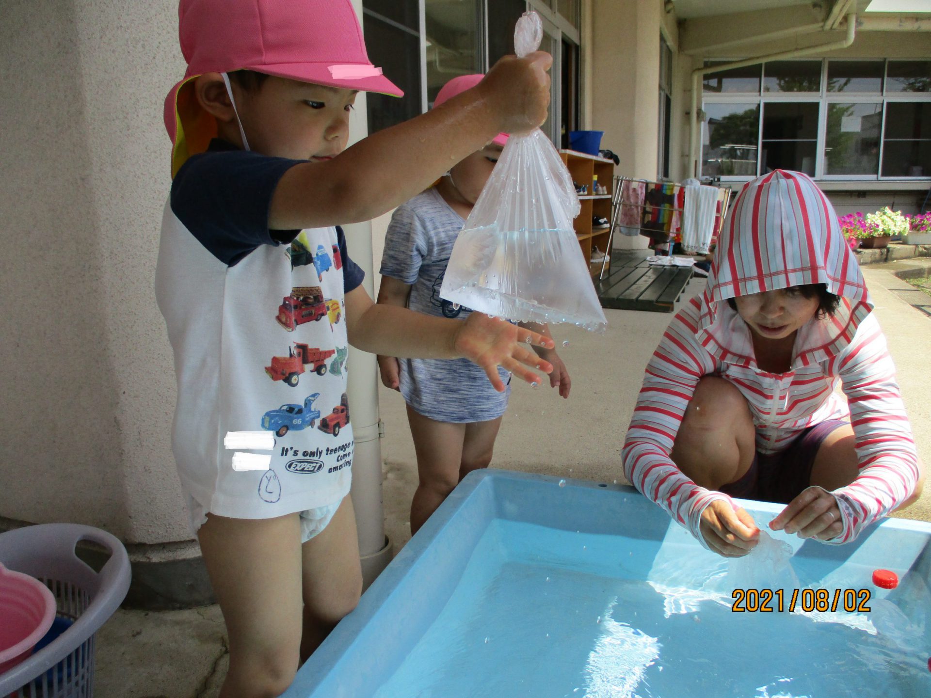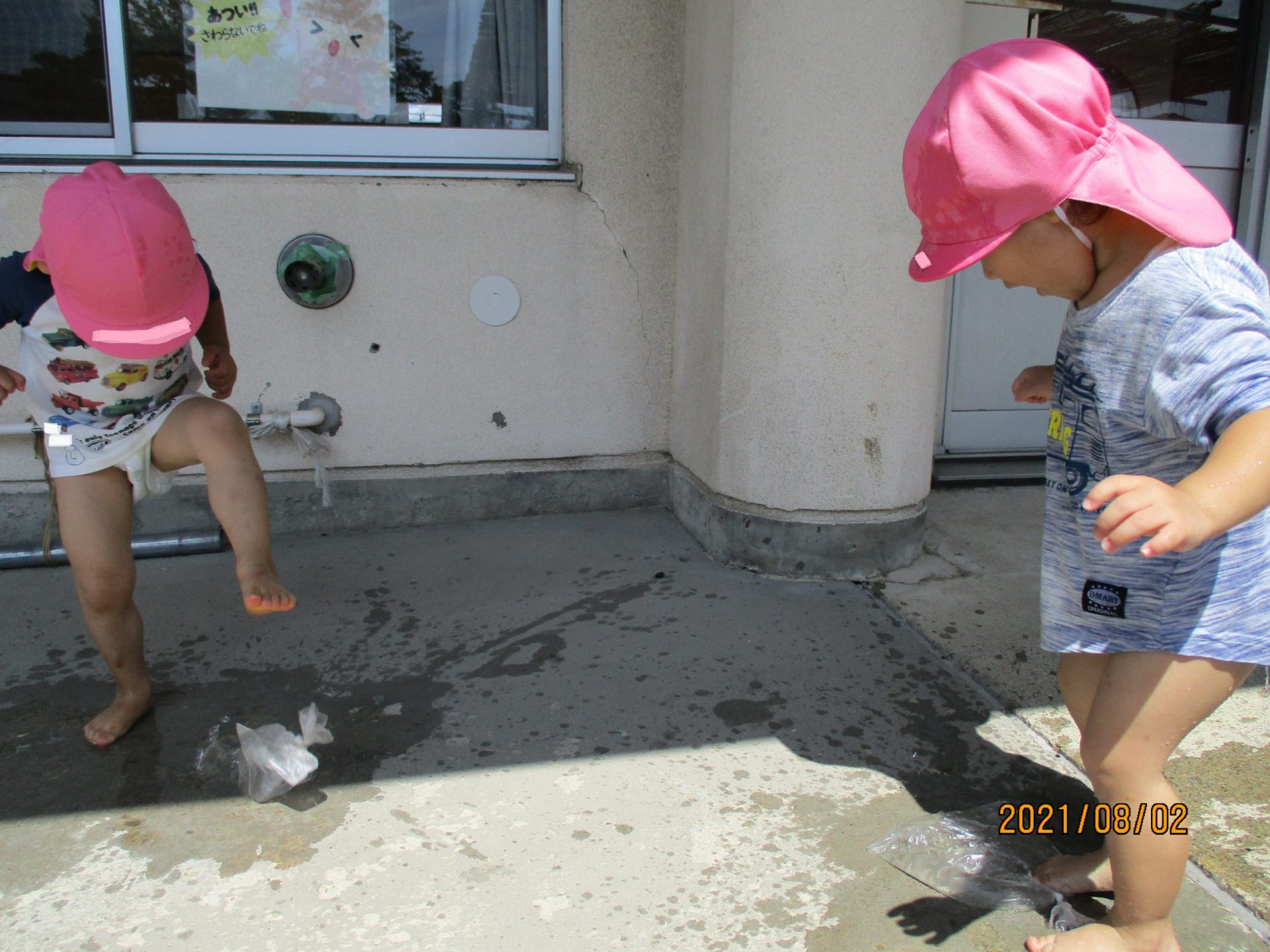 袋に水を入れて遊ぶのもお気に入りで、感触を楽しんだり手や足で割ってみたり!「お水遊び楽しいね〜!」という声が色んなところから聞こえてきました。