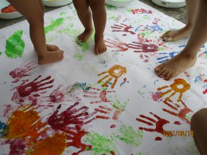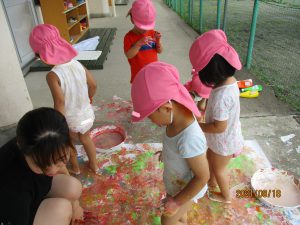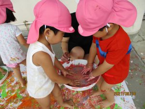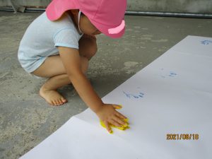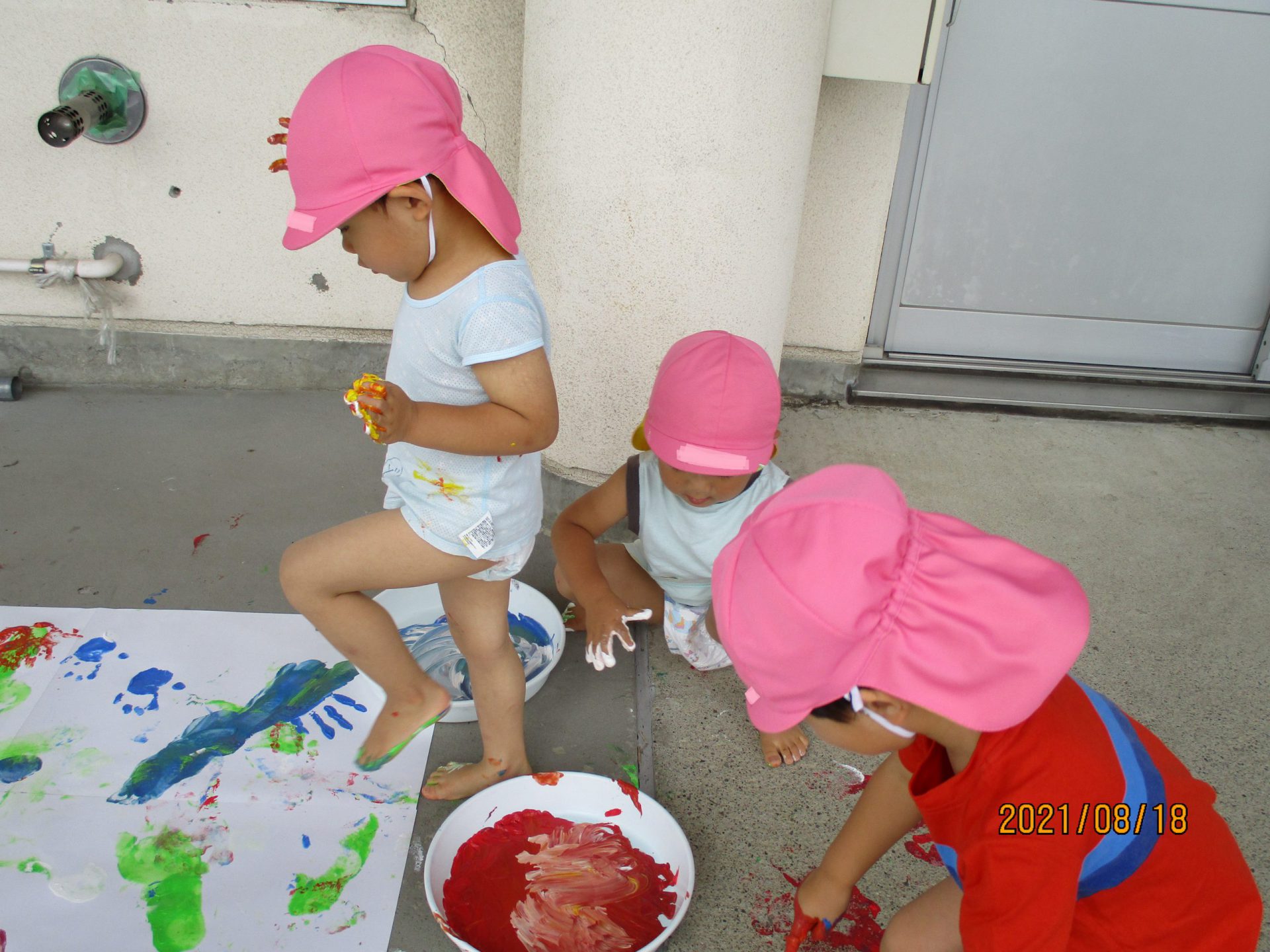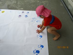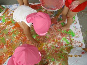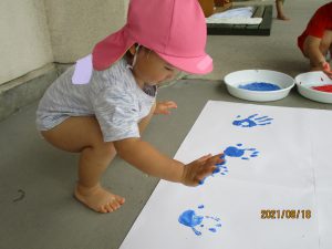 保育士が遊び方を教えなくても子どもたちだけでどんどん遊びを生み出していく姿から、子どもたちにとって必要なのは保育士がすべてを用意した環境ではなく、子どもたち自身で考えながら遊べる環境なのだと改めて感じました。絵の具遊びでは、子どもたちが「まだやりたいな」と思うくらいのほうが、手形や足あとがきれいに残っていて大人からすると出来栄えはいいかもしれません。ですが、今回絵の具遊びを行ってみて、「十分遊んだ!満足!!」と思えるまで夢中になって遊んだ証である一面絵の具だらけの紙のほうが何倍も素敵だと感じました。これからも、子どもたちの「やってみたい」「もっとやりたい」という気持ちを大切にしながら、遊びの中での様々な発見や楽しみを共有していきたいと思います!