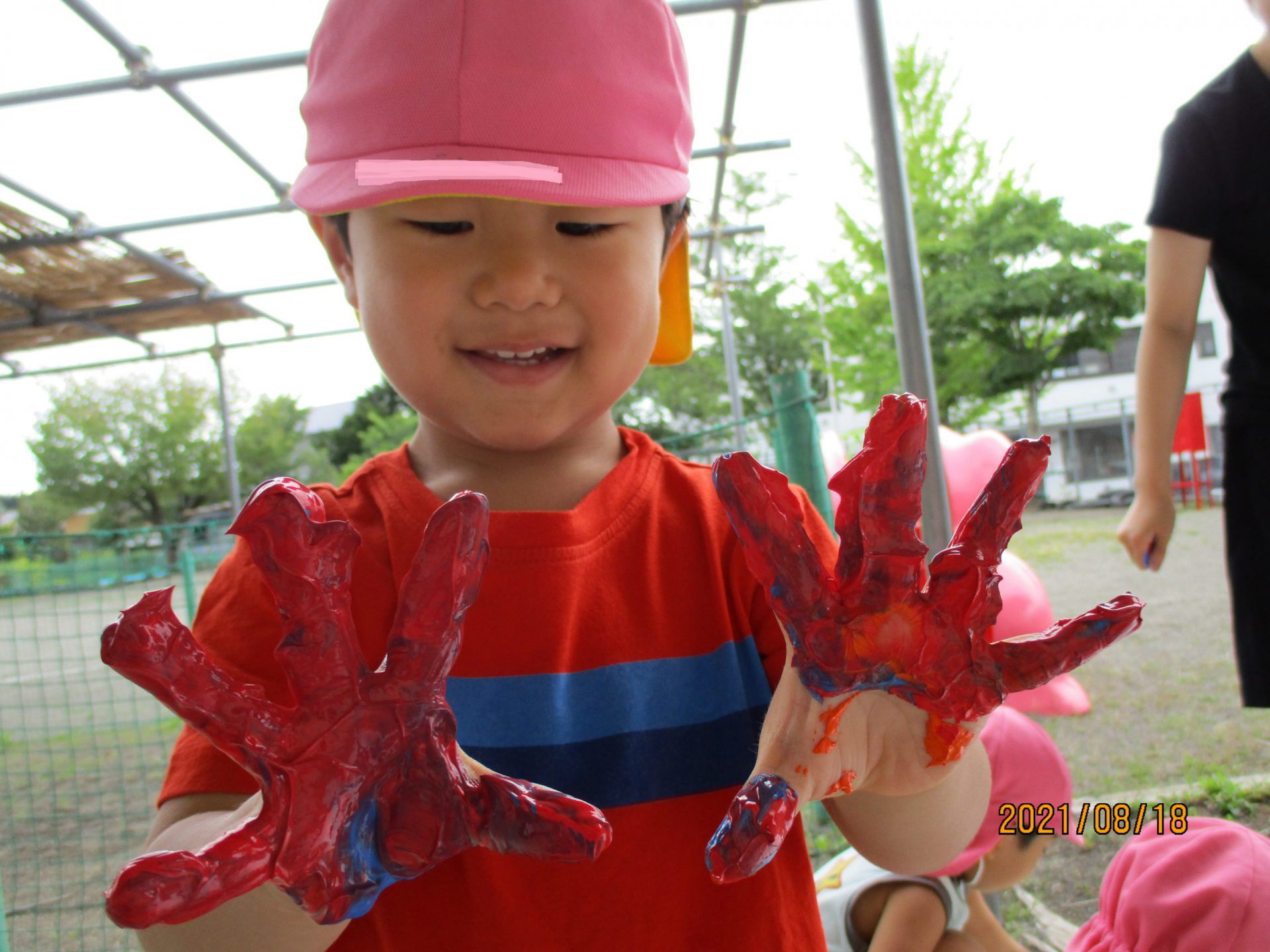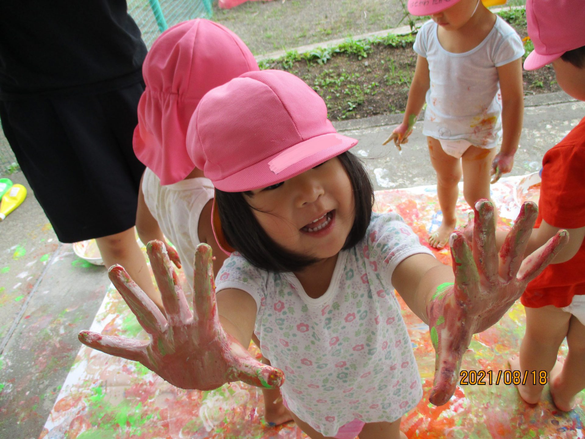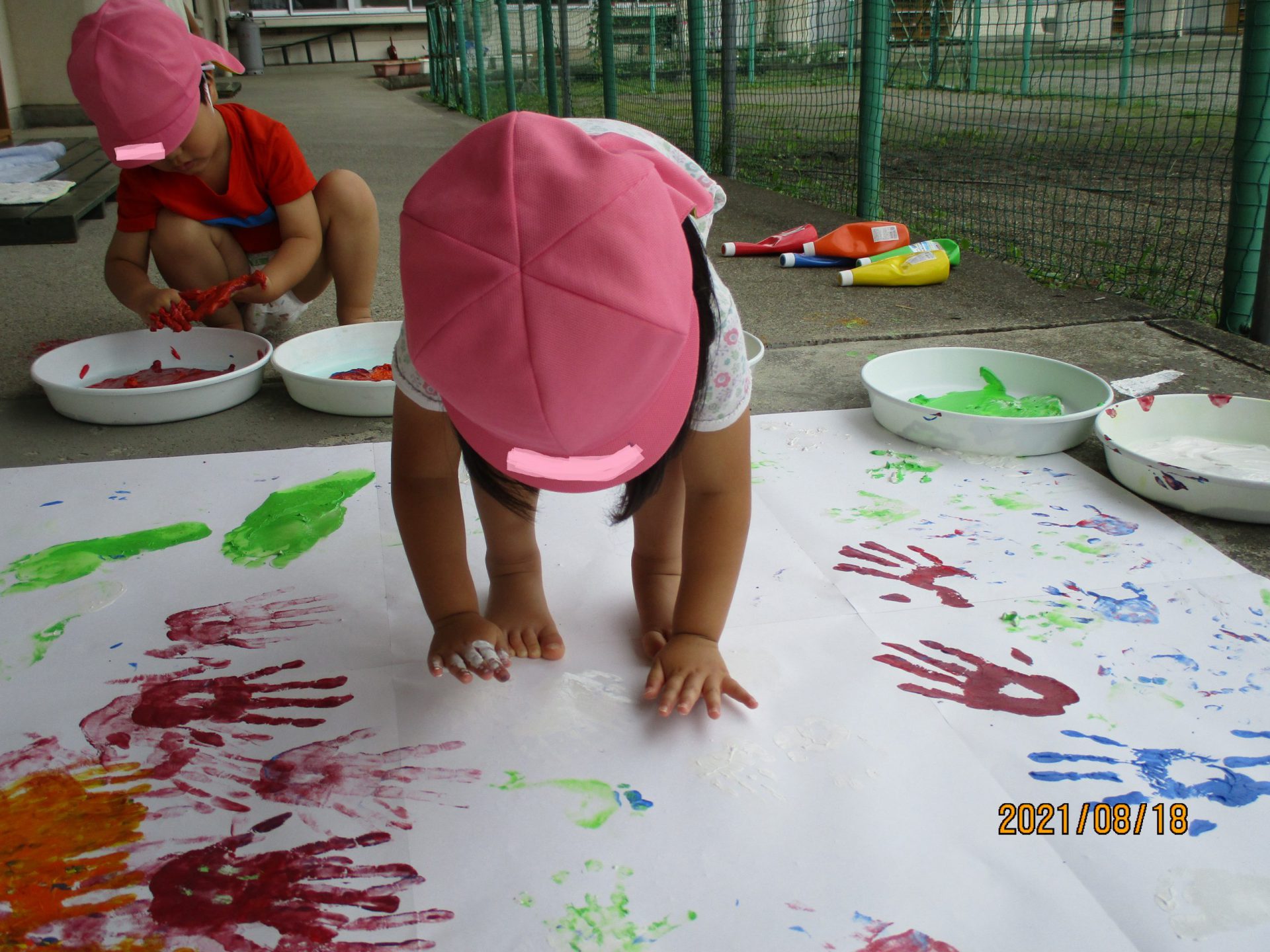 自分の手形がくっきり残ることに喜び、「ぬるぬる〜」「なんかきもち〜!」と絵の具の感触にも面白さを感じる姿が。そして、「楽しいね〜!」と、だんだん大胆になっていきました!