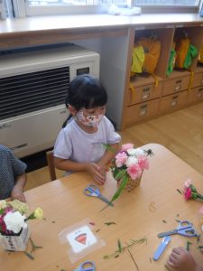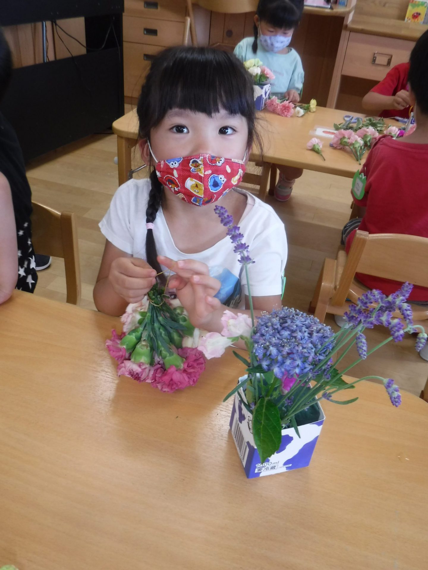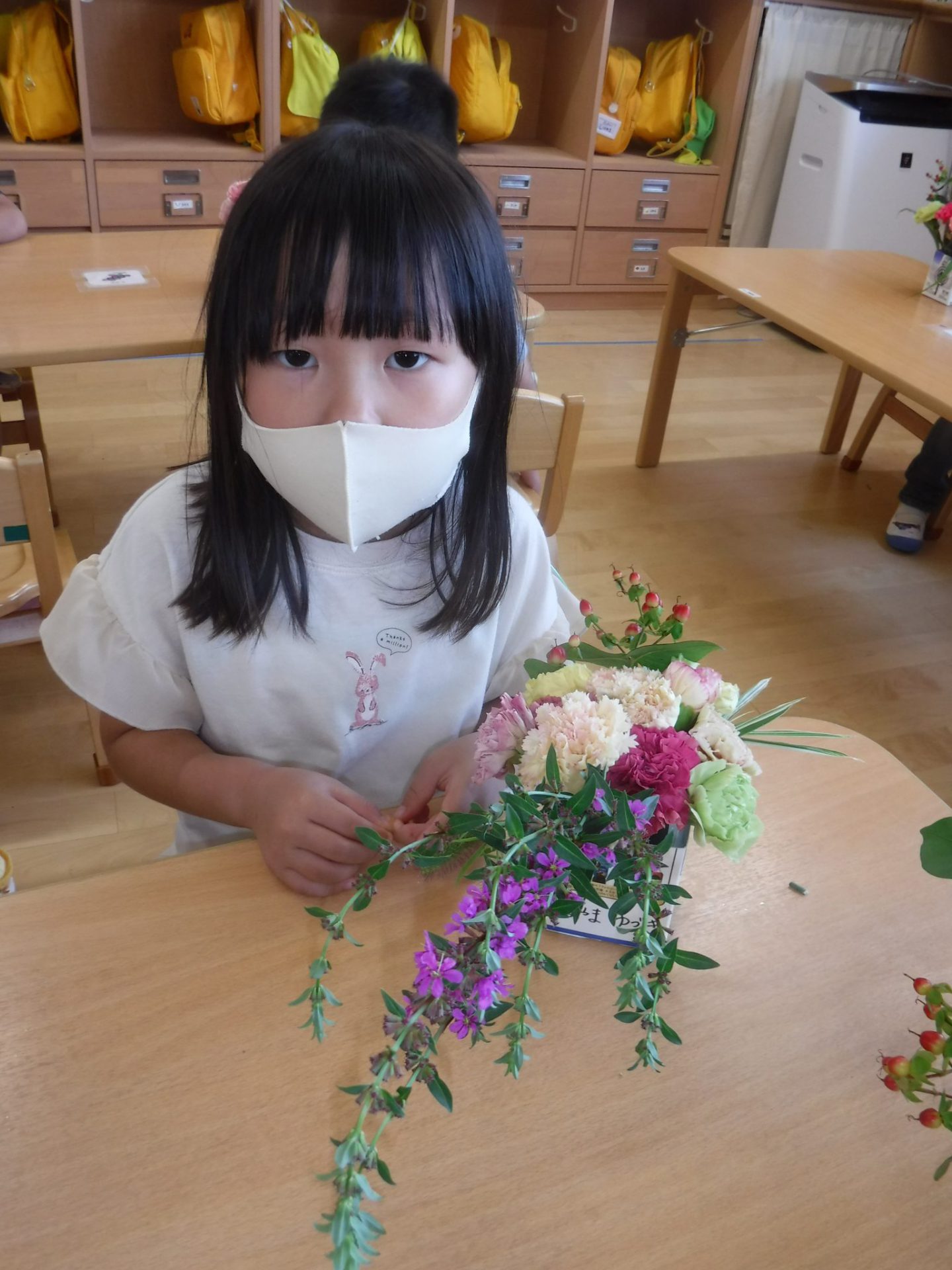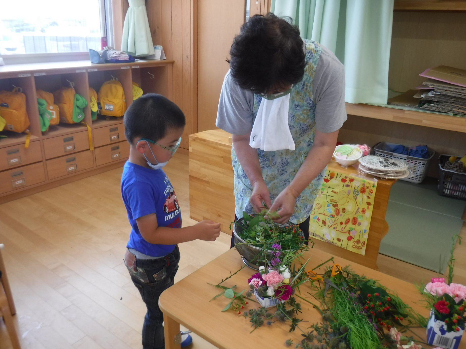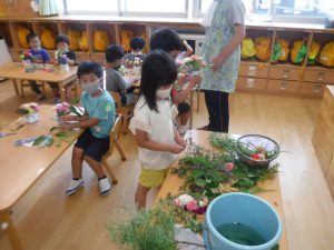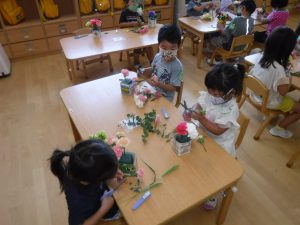 作る中で一つ一つの花の色や形の違いに気付いたり、匂いをかいで「いい匂い」と言ったり、大人が声をかけなくても、この時間の中でたくさんのことを気付いて感じていた子ども達です。