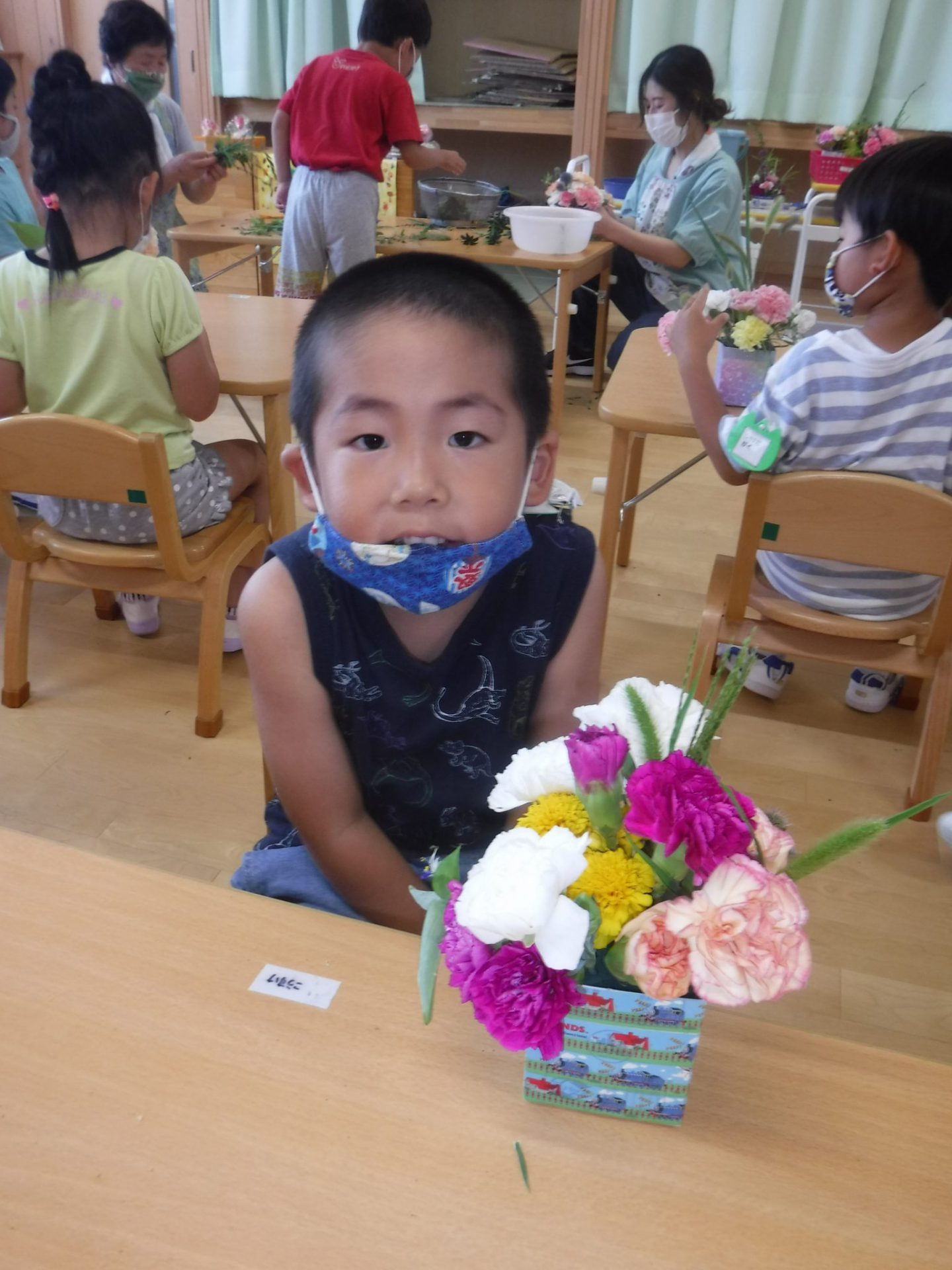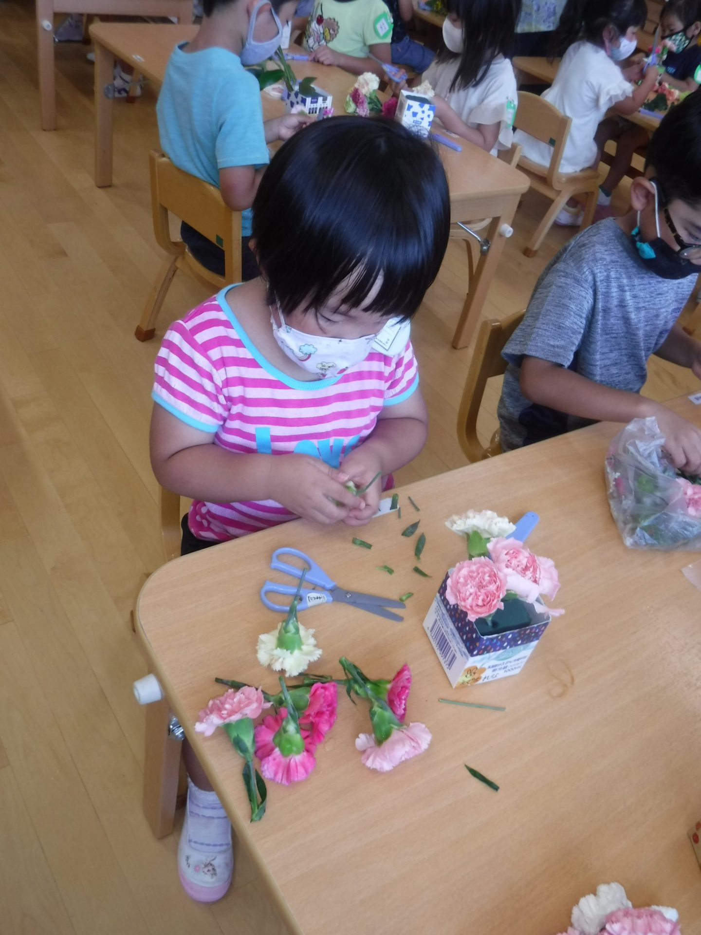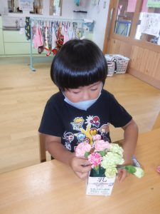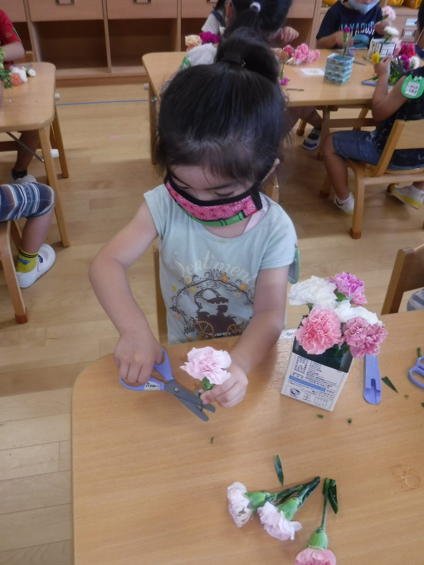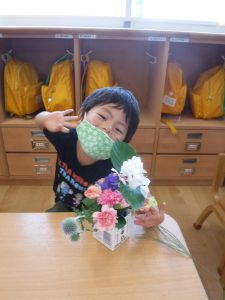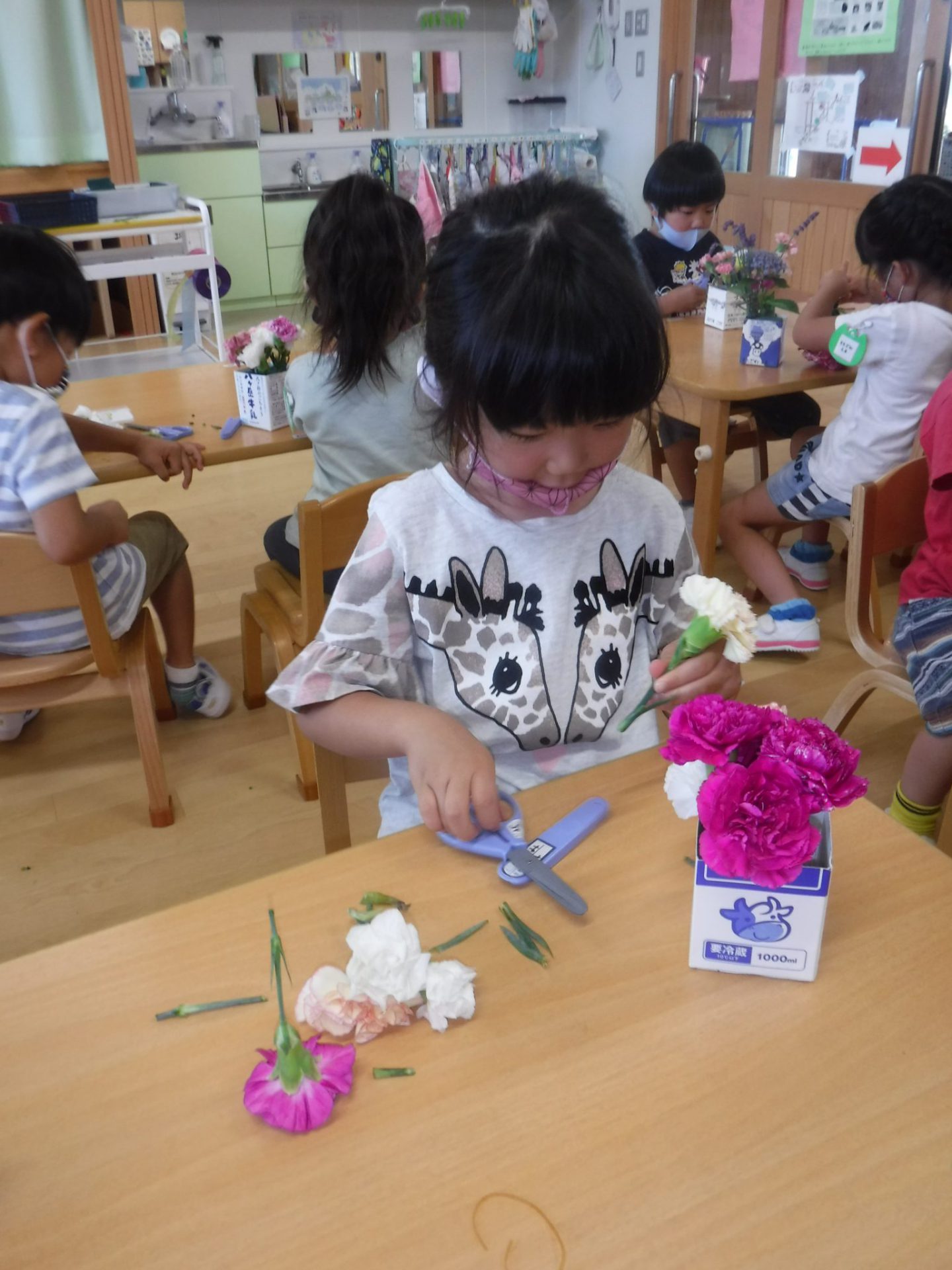 作る中で一つ一つの花の色や形の違いに気付いたり、匂いをかいで「いい匂い」と言ったり、大人が声をかけなくても、この時間の中でたくさんのことを気付いて感じていた子ども達です。
