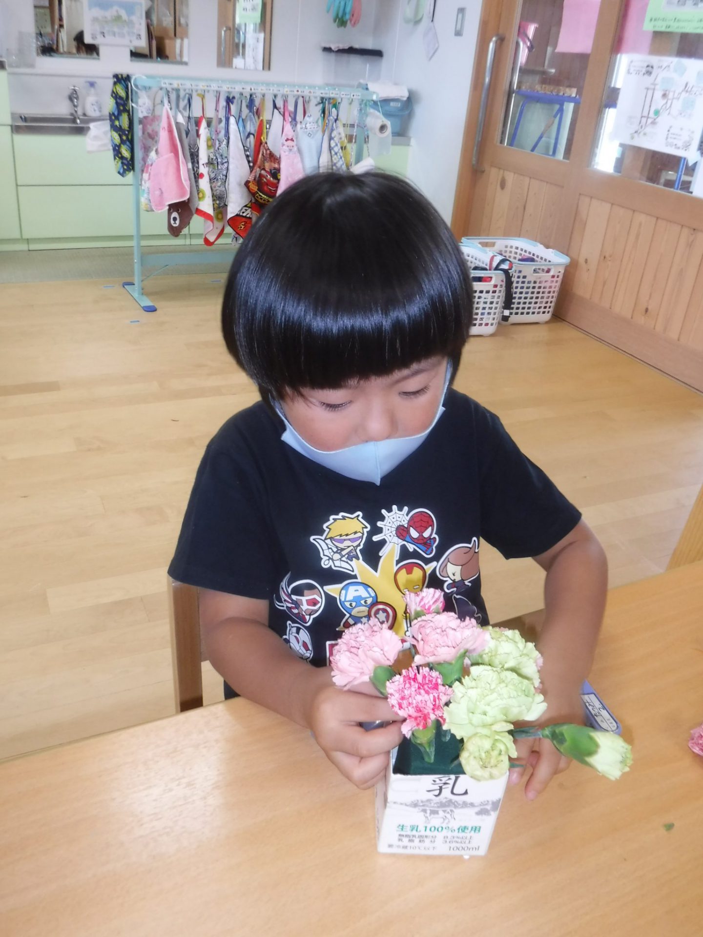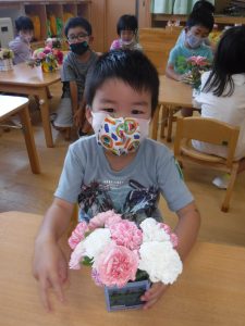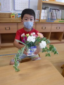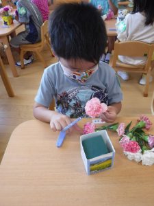「カーネーションのお花でいっぱいにしたい」「こうするとかわいい」「お母さんにあげるの」等、一人一人が自分なりに目的を持って作っていました。